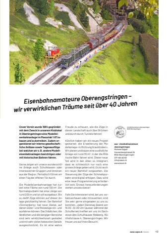 meine-region.ch meine-region.ch Vereine 491 Eisenbahnamateure Oberengstringen %u2013wir verwirklichen Tr%u00e4ume seit %u00fcber 40 JahrenUnser Verein wurde 1984 gegr%u00fcndet mit dem Zweck in unserem Klublokal in Oberengstringen eine Modelleisenbahnanlage im Massstab 1:87 zu bauen und zu betreiben. Zudem organisieren wir interne gesellschaftliche Anl%u00e4sse sowie Tagesausfl %u00fcge bei welchen wir z. B. andere Modelleisenbahnanlagen besichtigen oder mit historischen Bahnen fahren.Gerne zeigen wir unsere wundersch%u00f6ne Anlage auch Schulklassen oder interessierten Gruppen und Vereinen aus der Region. Periodisch f%u00fchren wir einen Tag der offenen T%u00fcr durch.Die Modelleisenbahnanlage hat zurzeit eine Fl%u00e4che von rund 100 m2. Die Normalspurbahn hat eine L%u00e4nge von rund 200 m und ist voll ausgebaut. Bis zu zw%u00f6lf Z%u00fcge k%u00f6nnen auf dieser Anlage gleichzeitig fahren. Der Bahnhof %u00abSonnenberg%u00bb hat neun Gleise, auf denen G%u00fcter- und Reisez%u00fcge ein- und ausfahren k%u00f6nnen. Das St%u00e4dtchen, die l%u00e4ndlichen und die bergigen Bereiche sind sehr wirklichkeitsnah gestaltet und mit sehr vielen liebevollen Details ausgeschm%u00fcckt. Es ist eine wahre Freude zu schauen, wie die Z%u00fcge in dieser Landschaft auch %u00fcber Br%u00fccken und durch durch Tunnels fahren!K%u00fcrzlich haben wir ein neues Projekt gestartet: die Erweiterung der Modellanlage %u00abin Richtung Graub%u00fcnden%u00bb. Wir planen und bauen eine zus%u00e4tzliche Anlage von rund 30 m2, in der die Rh%u00e4tische Bahn fahren wird. Dieser neue Teil wird in den Alten so integriert, dass es schliesslich nur noch eine grosse Anlage geben wird. Es ist auch ein neuer Bahnhof vorgesehen. Die Steuerung der Z%u00fcge der Schmalspurbahn wird digital erfolgen. Dazu wird eine neue Programmierung erforderlich sein. Grosse Herausforderungen stehen uns also bevor!Falls Sie interessiert sind, bei uns vorbeizuschauen oder mitzuwirken, sind Sie sehr gerne eingeladen zu uns zu kommen. Jeden Dienstag Abend von 19.00 - 22.00 Uhr (ausser w%u00e4hrend der Schulferien) treffen wir uns im Dachstock des Schulhauses Rebberg, R%u00fctihofstrasse 4, Oberengstringen. Wir freuen uns auf Ihren Besuch!eao - eisenbahnamateure oberengstringenMichele Olgiati Sonnenbergstrasse%u000925%u00098102%u0009Oberengstringen077%u0009464%u000992%u000993%u0009info@eaoe.ch www.eaoe.ch