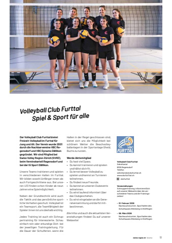 meine-region.ch meine-region.ch Vereine 51Juniorinnen%u0009U23Volleyball Club Furttal Spiel & Sport f%u00fcr alleDer Volleyball Club Furttal bietet Freizeit-Volleyball im Furttal f%u00fcr Jung und Alt. Der Verein wurde 2001 durch die Nachbarvereine VBC Regensdorf und VBC Dynamo D%u00e4llikon gegr%u00fcndet. Wir sind Mitglied bei Swiss Volley Region Z%u00fcrich (SVRZ), beim Vereinskartell Regensdorf und bei der IG Sport D%u00e4llikon.Unsere Teams trainieren und spielen in verschiedenen Hallen im Furttal. Wir bilden sowohl Anf%u00e4nger:innen als auch Fortgeschrittene aus. Bei unseren U13 fi nden schon Kinder ab neun Jahren eine Spielm%u00f6glichkeit.Neben der Grundtechnik wird auch die Taktik und das pers%u00f6nliche sportliche Verhalten geschult. Volleyball ist ein Teamsport, die Teamf%u00e4higkeit der Spieler:innen ist uns deshalb wichtig.Jedes Training ist auch ein Schnuppertraining f%u00fcr Interessierte. Schau einfach rein oder erkundige Dich bei der jeweiligen Trainingsleitung. F%u00fcr die Dauer der Schulferien, wenn die Hallen in der Regel geschlossen sind, bietet sich uns die M%u00f6glichkeit bei sch%u00f6nem Wetter die Beachvolleyballanlagen in der Sportanlage Gheid, Buchs zu nutzen.Werde Aktivmitglied%u2022 Du hast viel Spass.%u2022 Du kannst trainieren und spielen und h%u00e4ltst dich fi t.%u2022 Du lernst besser Volleyball zu spielen und kannst an Turnieren teilnehmen.%u2022 Du fi ndest neue Freunde.%u2022 Du kannst an unseren Clubevents teilnehmen.%u2022 Du wirst laufend informiert %u00fcber das Clubgeschehen.%u2022 Du wirst eingeladen an die Generalversammlung und darfst mitbestimmen.Alle Infos und auch die aktuellsten Veranstaltungen fi ndest Du auf unserer Webseite!Volleyball Club FurttalSekretariat8105%u0009RegensdorfTelefonsekretariat@vbcfurttal.chwww.vbcfurttal.ch%u0009%u0009%u0009%u0009%u0009%u0009%u0009%u0009vbcfurttalVeranstaltungenSchnuppertraining: informiere Dich auf%u0009unserer%u0009Webseite%u0009%u00fcber%u0009die%u0009verschiedene%u0009Teams%u0009und%u0009die%u0009Trainingszeiten!%u2022 01. Februar 2026 Nachwuchsturnier,%u0009Sporthallen%u0009des%u0009Schulhauses%u0009Ellenberg%u0009in%u0009Otelfi%u0009ngen%u2022 08. M%u00e4rz 2026 Nachwuchsturnier,%u0009Sporthallen%u0009des%u0009Schulhauses%u0009Ellenberg%u0009in%u0009Otelfi%u0009ngen