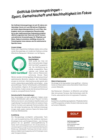 meine-region.ch meine-region.ch Vereine 61 Golfclub Unterengstringen %u2013 Sport, Gemeinschaft und Nachhaltigkeit im FokusDer Golfclub Unterengstringen ist seit 23 Jahren ein lebendiger Verein mit rund 390 aktiven Mitgliedern auf einem abwechslungsreichen 9-Loch-Platz. Das Angebot reicht von entspannten Plauschrunden bis zu den traditionsreichen Clubmeisterschaften. J%u00e4hrlich organisiert der Club mehr als 50 Turniere und zahlreiche Veranstaltungen f%u00fcr Mitglieder und G%u00e4ste. Dadurch entstehen vielf%u00e4ltige Anreize f%u00fcr Freizeitspieler:innen ebenso wie f%u00fcr ambitionierte Sportler:innen.Unsere AnlageNeben dem eigentlichen Golfplatz stehen eine umfassende %u00dcbungsanlage, ein modernes Clubhaus und das %u00f6ffentliche Restaurant %u00abNineteen%u00bb zur Verf%u00fcgung. Neu: Zertifi zierte Nachhaltigkeit2025 wurde der Club mit dem internationalen Siegel GEO Certifi ed%u00ae ausgezeichnet. Die Zertifi zierung best%u00e4tigt ausgew%u00e4hlte Massnahmen zum Schutz der Natur und zur Ressourcenschonung: Grosse Randfl %u00e4chen werden minimal gepfl egt, Beregnung wird auf spielrelevante Bereiche reduziert, der Chemikalieneinsatz ist minimiert. Gleichzeitig wurden gezielt zahlreiche Lebensr%u00e4ume geschaffen und erhalten %u2013 etwa grosse Biotope, Teiche, Totholzhaufen und Nistk%u00e4sten %u2013 die Amphibien, V%u00f6geln (z. B. Eisvogel) und Kleintieren Schutz bieten. Zudem setzen die Verantwortlichen auf moderne, energieeffi ziente Technik.Gemeinschaft & VeranstaltungenDas Vereinsleben ist breit gef%u00e4chert: Neben ernsthaften Wettk%u00e4mpfen gibt es auch Plausch-Turniere, Sektionsturniere in verschiedenen Spielformaten und regelm%u00e4ssige Freundschaftstreffen mit anderen Clubs. Charity-Turniere und regionale Partnerschaften st%u00e4rken die lokale Verankerung. Der Golfclub Unterengstringen stellt zudem mehrere Teams f%u00fcr Swiss-Golf/Interclub-Wettbewerbe.AusbildungDie %u00dcbungsanlage erm%u00f6glicht umfassendes Technik- und Kurzspieltraining. Drei Golfl ehrer betreuen Einsteiger:innen und Fortgeschrittene %u2013 vom Schnupperkurs bis zur gezielten Leistungsf%u00f6rderung im Swiss-Golf-Leistungszentrum. Ein strukturiertes Juniorenprogramm sorgt f%u00fcr kontinuierliche Nachwuchsf%u00f6rderung. Individuelle Trainings sind mit den Lehrern ebenso m%u00f6glich wie Gruppenkurse f%u00fcr Einsteiger:innen oder Fortgeschrittene.Golf Unterengstringen In den Schanzen 1 8103%u0009Unterengstringen044%u0009733%u000955%u000944info@golf-unterengstringen.ch%u0009www.golfunterengstringen.chG%u00e4ste & GastronomieDie Anlage ist f%u00fcr Gastspieler:innen ge%u00f6ffnet %u2014 Informationen zur Reservation und zu Startzeiten fi nden Sie auf unserer Webseite.Das Restaurant %u00abNineteen%u00bb ist %u00f6ffentlich und verf%u00fcgt %u00fcber eine grosse Terrasse. Das K%u00fcchenteam steht f%u00fcr frische, saisonale Gerichte mit regionalen Produkten.KontaktAusk%u00fcnfte zu Ausbildungsangeboten, Mitgliedschaften und %u00d6ffnungszeiten erhalten Sie beim Sekretariat oder auf unserer Webseite.