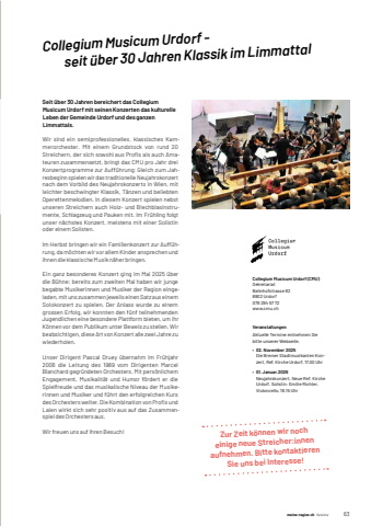 meine-region.ch meine-region.ch Vereine 631Collegium Musicum Urdorf - seit %u00fcber 30 Jahren Klassik im LimmattalSeit %u00fcber 30 Jahren bereichert das Collegium Musicum Urdorf mit seinen Konzerten das kulturelle Leben der Gemeinde Urdorf und des ganzen Limmattals.Wir sind ein semiprofessionelles, klassisches Kammerorchester. Mit einem Grundstock von rund 20 Streichern, der sich sowohl aus Profi s als auch Amateuren zusammensetzt, bringt das CMU pro Jahr drei Konzertprogramme zur Auff%u00fchrung: Gleich zum Jahresbeginn spielen wir das traditionelle Neujahrskonzert nach dem Vorbild des Neujahrskonzerts in Wien, mit leichter beschwingter Klassik, T%u00e4nzen und beliebten Operettenmelodien. In diesem Konzert spielen nebst unseren Streichern auch Holz- und Blechblasinstrumente, Schlagzeug und Pauken mit. Im Fr%u00fchling folgt unser n%u00e4chstes Konzert, meistens mit einer Solistin oder einem Solisten.Im Herbst bringen wir ein Familienkonzert zur Auff%u00fchrung, da m%u00f6chten wir vor allem Kinder ansprechen und ihnen die klassische Musik n%u00e4her bringen.Ein ganz besonderes Konzert ging im Mai 2025 %u00fcber die B%u00fchne: bereits zum zweiten Mal haben wir junge begabte Musikerinnen und Musiker der Region eingeladen, mit uns zusammen jeweils einen Satz aus einem Solokonzert zu spielen. Der Anlass wurde zu einem grossen Erfolg, wir konnten den f%u00fcnf teilnehmenden Jugendlichen eine besondere Plattform bieten, um ihr K%u00f6nnen vor dem Publikum unter Beweis zu stellen. Wir beabsichtigen, diese Art von Konzert alle zwei Jahre zu wiederholen.Unser Dirigent Pascal Druey %u00fcbernahm im Fr%u00fchjahr 2006 die Leitung des 1989 vom Dirigenten Marcel Blanchard gegr%u00fcndeten Orchesters. Mit pers%u00f6nlichem Engagement, Musikalit%u00e4t und Humor f%u00f6rdert er die Spielfreude und das musikalische Niveau der Musikerinnen und Musiker und f%u00fchrt den erfolgreichen Kurs des Orchesters weiter. Die Kombination von Profi s und Laien wirkt sich sehr positiv aus auf das Zusammenspiel des Orchesters aus.Wir freuen uns auf Ihren Besuch!Collegium Musicum Urdorf (CMU)SekretariatBahnhofstrasse%u0009828902%u0009Urdorf079%u0009294%u000957%u000972%u0009www.cmu.chVeranstaltungenAktuelle%u0009Termine%u0009entnehmen%u0009Sie%u0009bitte%u0009unserer%u0009Webseite.%u2022 02. November 2025Die%u0009Bremer%u0009Stadtmusikanten%u0009Konzert,%u0009Ref.%u0009Kirche%u0009Urdorf,%u000917.00%u0009Uhr%u2022 01. Januar.2026Neujahrskonzert,%u0009Neue%u0009Ref.%u0009Kirche%u0009Urdorf.%u0009Solistin: Emilie Richter, Violoncello,%u000918.15%u0009UhrZur Zeit k%u00f6nnen wir noch einige neue Streicher:innen auf nehmen. Bitte kontaktieren Sie uns bei Interesse!