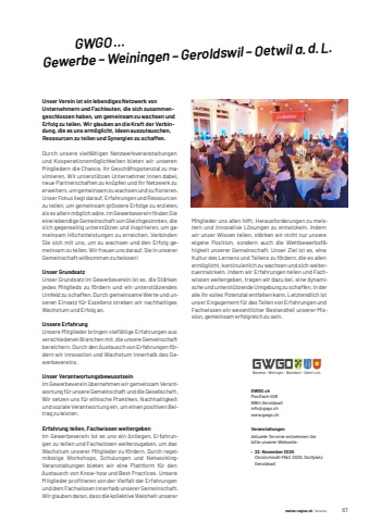 meine-region.ch meine-region.ch Vereine 671 GWGO %u2026Gewerbe %u2013 Weiningen %u2013 Geroldswil %u2013 Oetwil a. d. L.Unser Verein ist ein lebendiges Netzwerk von Unternehmern und Fachleuten, die sich zusammengeschlossen haben, um gemeinsam zu wachsen und Erfolg zu teilen. Wir glauben an die Kraft der Verbindung, die es uns erm%u00f6glicht, Ideen auszutauschen, Ressourcen zu teilen und Synergien zu schaffen. Durch unsere vielf%u00e4ltigen Netzwerkveranstaltungen und Kooperationsm%u00f6glichkeiten bieten wir unseren Mitgliedern die Chance, ihr Gesch%u00e4ftspotenzial zu maximieren. Wir unterst%u00fctzen Unternehmer:innen dabei, neue Partnerschaften zu kn%u00fcpfen und ihr Netzwerk zu erweitern, um gemeinsam zu wachsen und zu fl orieren. Unser Fokus liegt darauf, Erfahrungen und Ressourcen zu teilen, um gemeinsam gr%u00f6ssere Erfolge zu erzielen, als es allein m%u00f6glich w%u00e4re. Im Gewerbeverein fi nden Sie eine lebendige Gemeinschaft von Gleichgesinnten, die sich gegenseitig unterst%u00fctzen und inspirieren, um gemeinsam H%u00f6chstleistungen zu erreichen. Verbinden Sie sich mit uns, um zu wachsen und den Erfolg gemeinsam zu teilen. Wir freuen uns darauf, Sie in unserer Gemeinschaft willkommen zu heissen!Unser GrundsatzUnser Grundsatz im Gewerbeverein ist es, die St%u00e4rken jedes Mitglieds zu f%u00f6rdern und ein unterst%u00fctzendes Umfeld zu schaffen. Durch gemeinsame Werte und unseren Einsatz f%u00fcr Exzellenz streben wir nachhaltiges Wachstum und Erfolg an.Unsere ErfahrungUnsere Mitglieder bringen vielf%u00e4ltige Erfahrungen aus verschiedenen Branchen mit, die unsere Gemeinschaft bereichern. Durch den Austausch von Erfahrungen f%u00f6rdern wir Innovation und Wachstum innerhalb des Gewerbevereins.Unser VerantwortungsbewusstseinIm Gewerbeverein %u00fcbernehmen wir gemeinsam Verantwortung f%u00fcr unsere Gemeinschaft und die Gesellschaft. Wir setzen uns f%u00fcr ethische Praktiken, Nachhaltigkeit und soziale Verantwortung ein, um einen positiven Beitrag zu leisten.Erfahrung teilen, Fachwissen weitergebenIm Gewerbeverein ist es uns ein Anliegen, Erfahrungen zu teilen und Fachwissen weiterzugeben, um das Wachstum unserer Mitglieder zu f%u00f6rdern. Durch regelm%u00e4ssige Workshops, Schulungen und NetworkingVeranstaltungen bieten wir eine Plattform f%u00fcr den Austausch von Know-how und Best Practices. Unsere Mitglieder profi tieren von der Vielfalt der Erfahrungen und dem Fachwissen innerhalb unserer Gemeinschaft. Wir glauben daran, dass die kollektive Weisheit unserer GWGO.chPostfach%u00094098954%u0009Geroldswilinfo@gvgo.chwww.gwgo.chVeranstaltungenAktuelle%u0009Termine%u0009entnehmen%u0009Sie%u0009bitte%u0009unserer%u0009Webseite.%u2022 22. November 2025Christchindli-M%u00e4rt%u00092025,%u0009Dorfplatz%u0009GeroldswilMitglieder uns allen hilft, Herausforderungen zu meistern und innovative L%u00f6sungen zu entwickeln. Indem wir unser Wissen teilen, st%u00e4rken wir nicht nur unsere eigene Position, sondern auch die Wettbewerbsf%u00e4higkeit unserer Gemeinschaft. Unser Ziel ist es, eine Kultur des Lernens und Teilens zu f%u00f6rdern, die es allenerm%u00f6glicht, kontinuierlich zu wachsen und sich weiterzuentwickeln. Indem wir Erfahrungen teilen und Fachwissen weitergeben, tragen wir dazu bei, eine dynamische und unterst%u00fctzende Umgebung zu schaffen, in der alle ihr volles Potenzial entfalten kann. Letztendlich ist unser Engagement f%u00fcr das Teilen von Erfahrungen und Fachwissen ein wesentlicher Bestandteil unserer Mission, gemeinsam erfolgreich zu sein.