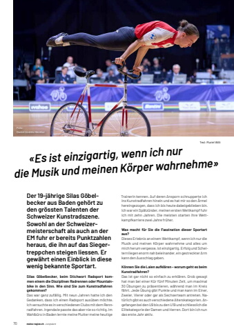 701 meine-region.ch meine-region.ch Jungtalent %u00abEs ist einzigartig, wenn ich nur die Musik und meinen K%u00f6rper wahrnehme%u00bbDer 19-j%u00e4hrige Silas G%u00f6belbecker aus Baden geh%u00f6rt zu den gr%u00f6ssten Talenten der Schweizer Kunstradszene. Sowohl an der Schweizermeisterschaft als auch an der EM fuhr er bereits Punktzahlen heraus, die ihn auf das Siegertreppchen steigen liessen. Er gew%u00e4hrt einen Einblick in diese wenig bekannte Sportart. Silas G%u00f6belbecker, beim Stichwort Radsport kommen einem die Disziplinen Radrennen oder Mountainbike in den Sinn. Wie sind Sie zum Kunstradfahren gekommen?Das war ganz zuf%u00e4llig. Mit neun Jahren hatte ich den Gedanken, dass ich einen Radsport aus%u00fcben m%u00f6chte. Ich versuchte es in verschiedenen Clubs mit dem Rennradfahren. Irgendwie passte das aber nie so richtig. Im Wahlb%u00fcro in Baden lernte meine Mutter meine heutige Trainerin kennen. Auf deren Ansporn schnupperte ich ins Kunstradfahren hinein und es hat mir so den %u00c4rmel hereingezogen, dass ich bis heute dabeigeblieben bin. Ich war ein Sp%u00e4tz%u00fcnder, meinen ersten Wettkampf fuhr ich mit zehn Jahren. Die meisten starten ihre Wettkampfkarriere zwei Jahre fr%u00fcher.Was macht f%u00fcr Sie die Faszination dieser Sportart aus?Dieses Erlebnis an einem Wettkampf, wenn ich nur die Musik und meinen K%u00f6rper wahrnehme und alles um mich herum vergesse, ist einzigartig. Erfolg und Scheitern liegen enorm nah beieinander, ein gestreckter Arm kann den Ausschlag geben.K%u00f6nnen Sie die Laien aufkl%u00e4ren %u2013 worum geht es beim Kunstradfahren?Das ist gar nicht so einfach zu erkl%u00e4ren. Grob gesagt hat man bei einer K%u00fcr f%u00fcnf Minuten Zeit, um maximal 30 %u00dcbungen zu pr%u00e4sentieren, w%u00e4hrend man im Kreis f%u00e4hrt. Jede %u00dcbung gibt Punkte und man kann im Einer, Zweier, Vierer oder gar als Sechserteam antreten. Nat%u00fcrlich gibt es auch verschiedene Alterskategorien. Angefangen bei den U9 bis zu den U19 und schliesslich die Elitekategorie der Damen und Herren. Dort bin ich nun das erste Jahr aktiv. Foto:Daniel Andr%u00e9s HecktorText:%u0009Muriel%u0009Willi