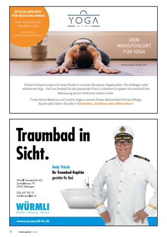 72 meine-region.ch Vereine mbad in .Andy Tr%u00f6schIhr Traumbad-Kapit%u00e4ngestaltet Ihr Bad. Traumbad in Sicht.Andy Tr%u00f6schIhr Traumbad-Kapit%u00e4ngestaltet Ihr Bad. Wu%u0308rmli_F12_Kampagne_2019.indd 2 DEIN WOHLF%u00dcHLORT F%u00dcR YOGAErlebe Entspannung und innere Ruhe in unseren Boutique-Yogastudios. Ob Anf%u00e4nger oder erfahrener Yogi %u2013 bei uns findest Du die passende Praxis in kleinen Gruppen mit pers%u00f6nlicher Betreuung durch erfahrene Lehrer:innen.Finde Deine Balance und mache Yoga zu einem festen Bestandteil Deines Alltags. Buche jetzt Deine Stunde in Altstetten, Dietikon oder Winterthur!SPEZIALANGEBOT F%u00dcR NEUKUND:INNENEINE KOSTENLOSE PROBEKLASSE!Anmeldung an namaste@yogainabag.comwww.yogainabag.com