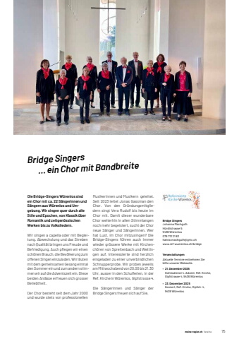 meine-region.ch meine-region.ch Vereine 751Bridge Singers %u2026 ein Chor mit BandbreiteDie Bridge-Singers W%u00fcrenlos sind ein Chor mit ca. 22 S%u00e4ngerinnen und S%u00e4ngern aus W%u00fcrenlos und Umgebung. Wir singen quer durch alle Stile und Epochen, von Klassik %u00fcber Romantik und zeitgen%u00f6ssischen Werken bis zu Volksliedern.Wir singen a capella oder mit Begleitung. Abwechslung und das Streben nach Qualit%u00e4t bringen uns Freude und Befriedigung. Auch pfl egen wir einen sch%u00f6nen Brauch, die Bev%u00f6lkerung zum offenen Singen einzuladen. Wir l%u00e4uten mit dem gemeinsamen Gesang einmal den Sommer ein und zum andern stimmen wir auf die Adventszeit ein. Diese beiden Anl%u00e4sse erfreuen sich grosser Beliebtheit.Der Chor besteht seit dem Jahr 2000 und wurde stets von professionellen Musikerinnen und Musikern geleitet. Seit 2023 leitet Jonas Gassman den Chor. Von den Gr%u00fcndungsmitgliedern singt Vera Rudolf bis heute im Chor mit. Damit dieser wunderbare Chor weiterhin in allen Stimmlangen noch mehr begeistert, sucht der Chor neue S%u00e4nger und S%u00e4ngerinnen. Wer hat Lust, im Chor mitzusingen? Die Bridge-Singers f%u00fchren auch immer wieder gr%u00f6ssere Werke mit Kirchench%u00f6ren von Spreitenbach und Wettingen auf. Interessierte sind herzlich eingeladen zu einer unverbindlichen Schnupperprobe. Wir proben jeweils am Mittwochabend von 20.00 bis 21.30 Uhr, ausser in den Schulferien, in der Ref. Kirche in W%u00fcrenlos, Gipfstrasse 4.Die S%u00e4ngerinnen und S%u00e4nger der Bridge Singers freuen sich auf Sie.Bridge SingersJohanna%u0009MachguthH%u00fcrdlistrasse%u000955436%u0009W%u00fcrenlos079%u0009713%u000921%u000983hanna.machguth@gmx.chwww.ref-wuerenlos.ch/bridgeVeranstaltungenAktuelle%u0009Termine%u0009entnehmen%u0009Sie%u0009bitte%u0009unserer%u0009Webseite.%u2022 21. Dezember 2025Gottesdienst%u00094.%u0009Advent,%u0009Ref.%u0009Kirche,%u0009Gipfstrasse%u00094,%u00095436%u0009W%u00fcrenlos%u2022 23. Dezember 2025Konzert,%u0009Ref.%u0009Kirche,%u0009Gipfstr.%u00094,%u00095436%u0009W%u00fcrenlos