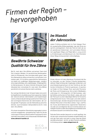 61 meine-region.ch meine-region.ch Kurzfirmenportr%u00e4ts Kurzfi rmenportr%u00e4tsFirmen der Region %u2013 hervorgehobenBew%u00e4hrte Schweizer Qualit%u00e4t f%u00fcr Ihre Z%u00e4hneBei Dr. med. dent. Nico B%u00fchler und seinem Team sind Sie in besten H%u00e4nden. Ihr pers%u00f6nliches Wohlergehen steht im Mittelpunkt: Hier wird alles daf%u00fcr getan, dass Ihre Behandlung v%u00f6llig schmerzfrei und effi zient vonstatten geht. Es ist keine unpers%u00f6nliche Zahnarztpraxis-Kette mit unz%u00e4hligen Niederlassungen, sondern eine eigenst%u00e4ndige und unabh%u00e4ngige, inhabergef%u00fchrte Zahnarztpraxis, f%u00fcr deren h%u00f6chste Schweizer Qualit%u00e4tsarbeit der Limmattaler Dr. med. dent. Nico B%u00fchler pers%u00f6nlich mit seinem Namen steht und b%u00fcrgt. Nur wenige Zahn%u00e4rzte in der Schweiz haben eine solch breitgef%u00e4cherte Ausbildung auf dem gesamten Gebiet der rekonstruktiven Zahnmedizin und Implantologie sowie umfassende jahrelange praktische Erfahrung in den wichtigsten Bereichen der Zahnmedizin, der vorbeugenden Prophylaxe und der Behandlung verschiedenster, auch komplexer Zahnprobleme wie Dr. med. dent. Nico B%u00fchler.Mit einem kompletten Dienstleistungsangebot sind er und sein engagiertes, sympathisches Team f%u00fcr Sie da und sorgen mit einer professionellen Prophylaxe f%u00fcr eine optimale Gesundheit und umfassendes Wohlbefi nden. www.zahnarzt-buehler.chIm Wandel der JahreszeitenJeden Fr%u00fchling entfaltet sich im Park Seleger Moor ein zauberhaftes Bl%u00fctenspektakel, das alle Sinne anspricht und begeistert. Doch der Park ist mehr als nur ein grandioses Farbenmeer: Auf rund sieben Kilometern gepfl egter Wege und Pfade l%u00e4dt er Jung und Alt zu Entdeckungen und Abenteuern ein. Drei Kilometer dieser Wege sind ausserdem rollstuhlg%u00e4ngig.Kinder k%u00f6nnen mit dem Abenteuer-Rucksack die Natur erkunden, an den Teichen Fr%u00f6sche beobachten, seltene V%u00f6gel entlang des Vogelwegs entdecken und anschliessend gemeinsam mit der Familie an der idyllischen Grillstelle ein Picknick geniessen. Erwachsene fi nden im Park Seleger Moor wertvolle Momente der Ruhe und Entspannung: Sei es beim Waldbaden, unterwegs im %u00abSinnesgarten mit Barfussweg%u00bb oder bei Kaffee und Kuchen im Park-Beizli. Jedes Jahr wird der Park auch zu einer lebendigen B%u00fchne f%u00fcr Konzerte, zeitgen%u00f6ssische Kunst, F%u00fchrungen und viele weitere Veranstaltungen, die %u00fcber die gesamte Saison bis Ende Oktober Menschen in ihren Bann ziehen. Yoga- und Pilates- Kurse, das Erlebnis einer Japanischen Teezeremonie oder ein sonnt%u00e4glicher Brunch inmitten dieser einmaligen Kulisse runden das Angebot ab und bieten eine erholsame Auszeit vom hektischen Alltag. Teile des Parks werden bewusst nur sanft gepfl egt, damit der wild-romantische Charakter erhalten bleibt und sich der Park mehr und mehr zu einer Oase der Biodiversit%u00e4t entwickelt %u2013 ein Ort, an dem Mensch und Natur im Einklang stehen. www.selegermoor.ch