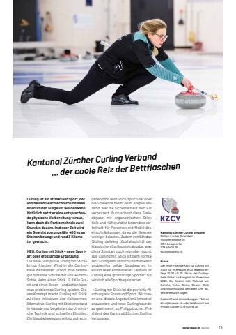 meine-region.ch meine-region.ch Vereine 791Kantonal Z%u00fcrcher Curling Verband %u2026 der coole Reiz der Bettfl aschenCurling ist ein attraktiver Sport, der von beiden Geschlechtern und allen Altersstufen ausge%u00fcbt werden kann. Nat%u00fcrlich setzt er eine entsprechende physische Vorbereitung voraus, kann doch die Partie mehr als zwei Stunden dauern. In dieser Zeit wird ein Gewicht von ungef%u00e4hr 400 kg an Steinen bewegt und rund 3 Kilometer gewischt.NEU: Curling mit Stick %u2013 neue Sportart oder grossartige Erg%u00e4nzungDie neue Disziplin %u00abCurling mit Stick%u00bb bringt frischen Wind in die Curlinghalle Weihermatt Urdorf. Man nehme gut haftende Schuhe mit Anti-RutschSohle, Helm, einen Stick, 19,8 Kilo Granit und einen Besen %u2013 und schon kann man problemlos Curling spielen. Dieses Konzept macht Curling mit Stick zu einer inklusiven und risikoarmen Alternative. Curling mit Stick entstand in Kanada und begeistert durch einfache Technik und schnellen Einstieg. Die Abgabebewegung erfolgt aufrecht gehend mit dem Stick, sprich der oder die Spielende bleibt beim Abspiel stehend, was die Sicherheit auf dem Eis verbessert. Auch schont diese Steinabgabe mit ergonomischen Stick Knie und H%u00fcfte und ist besonders vorteilhaft f%u00fcr Personen mit Mobilit%u00e4tseinschr%u00e4nkungen, da es die Gelenke weniger belastet. Zudem entf%u00e4llt das Sliding delivery (Ausfallschritt) der klassischen Curlingsteinabgabe, was diese Sportart noch reizvoller macht. Das Curling mit Stick ist dem normalen Curling sehr %u00e4hnlich und man kann problemlos beide Abgabearten in einem Team kombinieren. Deshalb ist Curling eine grossartige Sportart f%u00fcr wirklich alle Sportbegeisterten. %u00abCurling mit Stick ist die perfekte Mischung aus Spass und Sport. Wir freuen uns, dieses Angebot im Limmattal anzubieten und neue Curlingfreunde zu gewinnen%u00bb, so Philipp Locher, Pr%u00e4sident des Kantonal Z%u00fcrcher Curling Verbandes.Kantonal Z%u00fcrcher Curling VerbandPhilipp Locher, Pr%u00e4sidentM%u00fclibgerstrasse%u0009268914%u0009Aeugstertal079%u0009404%u000916%u000936kzcv@bluewin.chKurseDer%u0009neue%u00094-teilige%u0009Kurs%u0009f%u00fcr%u0009Curling%u0009mit%u0009Stick%u0009f%u00fcr%u0009Interessierte%u0009ist%u0009jeweils%u0009freitags%u0009 10.00%u0009 -11.30%u0009 Uhr%u0009 in%u0009 der%u0009 Curlinghalle%u0009Urdorf%u0009und%u0009beginnt%u0009im%u0009November%u00092025.%u0009 Die%u0009 Kosten%u0009 inkl.%u0009 Material%u0009 wie%u0009Schuhe,%u0009 Helm,%u0009 Steine,%u0009 Besen,%u0009 Stick%u0009und%u0009 Eisben%u00fctzung%u0009 betragen%u0009 CHF%u0009 60.%u0009Weitere%u0009Kurse%u0009folgen.%u0009Auskunft%u0009 und%u0009 Anmeldung%u0009 per%u0009 Mail%u0009 an%u0009kzcv@bluewin.ch%u0009oder%u0009telefonisch%u0009bei%u0009Philipp Locher:%u0009079%u0009404%u000916%u000936.