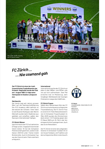 meine-region.ch meine-region.ch Vereine 81M%u00e4rz%u00092025:%u0009Der%u000916.%u0009Cupsieg%u0009der%u0009FC%u0009Z%u00fcrich%u0009FrauenFC Z%u00fcrich %u2026 %u2026 Nie usenand gahDer FC Z%u00fcrich ist einer der traditionsreichsten Fussballvereine der Schweiz. Gegr%u00fcndet wurde der Club am 1. August 1896. Er tr%u00e4gt seine Heimspiele im Stadion Letzigrund aus. NachwuchsDer Verein legt seit Jahren grossen Wert auf die Nachwuchsf%u00f6rderung. Die FCZ Academy z%u00e4hlt defi nitiv zu den besten der Schweiz. Viele Talente wie Ricardo Rodr%u00edguez oder Blerim D%u017eemaili wurden beim Stadtclub ausgebildet und schafften sp%u00e4ter den Sprung in internationale Topligen.FC Z%u00fcrich M%u00e4nnerSportlich blickt der FCZ auf zahlreiche Erfolge zur%u00fcck. Insgesamt konnte der Verein bisher 13-mal die Schweizer Meisterschaft gewinnen, zuletzt in der Saison 2021/22 unter Trainer Andr%u00e9 Breitenreiter. Auch im Schweizer Cup war der Club mit zehn Titeln mehrfach erfolgreich.InternationalInternational machte der FC Z%u00fcrich vor allem in den 1960er- und 1970er-Jahren auf sich aufmerksam. Zwei Mal erreichte man im Meistercup, dem Vorg%u00e4nger-Wettbewerb der heutigen Champions League das Halbfi nale, .FC Z%u00fcrich FrauenNeben dem M%u00e4nnerteam f%u00fchrt der FC Z%u00fcrich auch eine %u00e4usserst erfolgreiche Frauenabteilung. Die FC Z%u00fcrich Frauen sind mit 24 Titeln Rekordmeisterinnen im Schweizer Frauenfussball. Im M%u00e4rz 2025 wurden die Z%u00fcrcherinnen dank einem 1:0-Finalsieg gegen den FC Basel 1893 zum 16. Mal in der Vereinsgeschichte Cupsiegerinnen. Auch das ist ein Rekordwert.Der FC Z%u00fcrich ist einer der pr%u00e4genden Vereine im Schweizer Fussball mit einer treuen Fanbasis, viel Tradition und dem erfolgreichen Blick in die Zukunft.FC Z%u00fcrichGesch%u00e4ftsstelle:%u0009Helen%u0009Keller%u0009Str.%u000960Postfach8051%u0009Z%u00fcrich043%u0009521%u000912%u000912info@fcz.ch