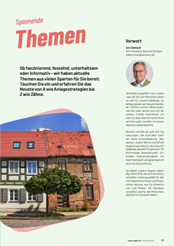 meine-region.ch meine-region.ch Themenberichte 851ThemenOb faszinierend, fesselnd, unterhaltsam oder informativ %u2013 wir haben aktuelle Themen aus vielen Sparten f%u00fcr Sie bereit. Tauchen Sie ein und erfahren Sie das Neuste von A wie Anlagestrategien bis Z wie Z%u00e4hne. SpannendeVorwortUrs ClementVR-Pr%u00e4sident, Brem & Schwarz Elektroinstallationen AGVer%u00e4nderung geh%u00f6rt zum Leben %u2013 das gilt f%u00fcr uns Menschen ebenso wie f%u00fcr unsere Geb%u00e4ude. Im Alltag passen wir Gewohnheiten an, richten unsere Wohnungen neu ein oder lassen uns von aktuellen Trends inspirieren. Immer so, dass das Vertraute nicht verloren geht, sondern im neuen Rahmen weiterbesteht.%u00c4hnlich verh%u00e4lt es sich mit Sanierungen. Sie sind weit mehr als reine Instandhaltung: Wer saniert, wahrt Werte und %u00f6ffnet zugleich den Blick in die Zukunft. Geb%u00e4ude werden fi t gemacht f%u00fcr kommende Generationen, verbinden Zweckm%u00e4ssigkeit mit Nachhaltigkeit und gewinnen oft auch an Ausstrahlung.So bleibt unsere Region lebendig. Denn Orte, die sich erneuern, schaffen Lebensqualit%u00e4t f%u00fcr alle %u2013 f%u00fcr Eigent%u00fcmerinnen und Eigent%u00fcmer ebenso wie f%u00fcr Mieterinnen und Mieter, f%u00fcr Nachbarschaften und f%u00fcr die Menschen, die hier ihr Zuhause haben.