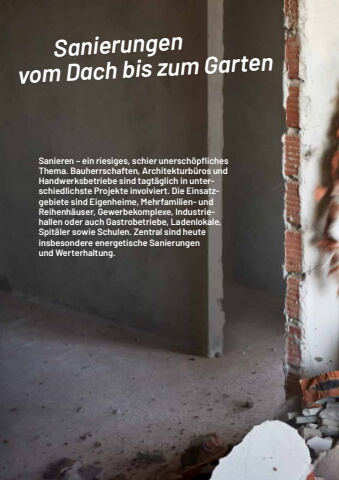 861 meine-region.ch Gewerbe- und Vereinsmagazin ThemenberichteThemenberichteSanieren %u2013 ein riesiges, schier unersch%u00f6pfl iches Thema. Bauherrschaften, Architekturb%u00fcros und Handwerksbetriebe sind tagt%u00e4glich in unterschiedlichste Projekte involviert. Die Einsatzgebiete sind Eigenheime, Mehrfamilien- und Reihenh%u00e4user, Gewerbekomplexe, Industriehallen oder auch Gastrobetriebe, Ladenlokale, Spit%u00e4ler sowie Schulen. Zentral sind heute insbesondere energetische Sanierungen und Werterhaltung. Sanierungen vom Dach bis zum Garten