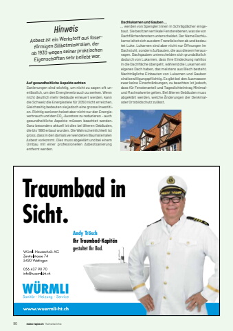 905 meine-region.ch meine-region.ch ThemenberichteAuf gesundheitliche Aspekte achtenSanierungen sind wichtig, um nicht zu sagen oft unerl%u00e4sslich, um den Energieverbrauch zu senken. Wenn nicht deutlich mehr Geb%u00e4ude erneuert werden, kann die Schweiz die Energieziele f%u00fcr 2050 nicht erreichen. Gleichzeitig bedeuten sie jedoch eine grosse Investition. Richtig sanieren heisst aber nicht nur den Energieverbrauch und den CO2-Ausstoss zu reduzieren %u2013 auch gesundheitliche Aspekte m%u00fcssen beachtet werden. Ganz besonders aktuell ist dies bei %u00e4lteren Geb%u00e4uden, die bis 1990 erbaut wurden. Die Wahrscheinlichkeit ist gross, dass in den damals verwendeten Baumaterialen Asbest vorkommt. Dies muss abgekl%u00e4rt und bei einem Umbau mit einer professionellen Asbestsanierung entfernt werden.Dachlukarnen und Gauben ...... werden von Spengler:innen in Schr%u00e4gd%u00e4cher eingebaut. Sie besitzen vertikale Fensterebenen, was sie von Dachfl %u00e4chenfenstern unterscheidet. Der Name Dachlukarne leitet sich aus dem Franz%u00f6sischen ab und bedeutet Luke. Lukarnen sind aber nicht nur %u00d6ffnungen im Dachstuhl, sondern Aufbauten, die aus diesem herausragen. Dachgauben unterscheiden sich grunds%u00e4tzlich dadurch von Lukarnen, dass ihre Eindeckung nahtlos in die Dachfl %u00e4che %u00fcbergeht, w%u00e4hrend die Lukarnen ein eigenes Dach haben, das meistens aus Blech besteht. Nachtr%u00e4gliche Einbauten von Lukarnen und Gauben sind bewilligungspfl ichtig. Es gibt bei den Ausmassen zwar keine Einschr%u00e4nkungen, zu beachten ist jedoch, dass f%u00fcr Fensteranteil und Tageslichteintrag Minimalund Maximalwerte gelten. Bei %u00e4lteren Geb%u00e4uden muss abgekl%u00e4rt werden, welche %u00c4nderungen der Denkmaloder Ortsbildschutz zul%u00e4sst.HinweisAsbest ist ein Werkstoff aus faserf%u00f6rmigen Silikatmineralien, der ab 1930 wegen seiner praktischen Eigenschaften sehr beliebt war.Inserat halbseitig, 186 x 134 mmmbad in .Andy Tr%u00f6schIhr Traumbad-Kapit%u00e4ngestaltet Ihr Bad. Traumbad in Sicht.Andy Tr%u00f6schIhr Traumbad-Kapit%u00e4ngestaltet Ihr Bad. Wu%u0308rmli_F12_Kampagne_2019.indd 2