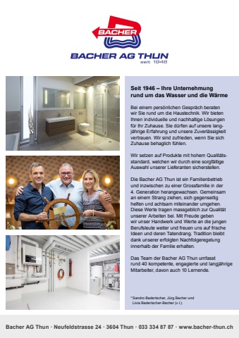 meine-region.ch Berufsbild 103Bacher AG Thun %u00b7 Neufeldstrasse 24 %u00b7 3604 Thun %u00b7 033 334 87 87 %u00b7 www.bacher-thun.chSeit 1946 %u2013 Ihre Unternehmung rund um das Wasser und die W%u00e4rmeBei einem pers%u00f6nlichen Gespr%u00e4ch beraten wir Sie rund um die Haustechnik. Wir bieten Ihnen individuelle und nachhaltige L%u00f6sungen f%u00fcr Ihr Zuhause. Sie d%u00fcrfen auf unsere langj%u00e4hrige Erfahrung und unsere Zuverl%u00e4ssigkeit vertrauen. Wir sind zufrieden, wenn Sie sich Zuhause behaglich f%u00fchlen.Wir setzen auf Produkte mit hohem Qualit%u00e4tsstandard, welchen wir durch eine sorgf%u00e4ltige Auswahl unserer Lieferanten sicherstellen.Die Bacher AG Thun ist ein Familienbetrieb und inzwischen zu einer Grossfamilie in der 4. Generation herangewachsen. Gemeinsam an einem Strang ziehen, sich gegenseitig helfen und achtsam miteinander umgehen. Diese Werte tragen massgeblich zur Qualit%u00e4t unserer Arbeiten bei. Mit Freude geben wir unser Handwerk und Werte an die jungen Berufsleute weiter und freuen uns auf frische Ideen und deren Tatendrang. Tradition bleibt dank unserer erfolgten Nachfolgeregelung innerhalb der Familie erhalten.Das Team der Bacher AG Thun umfasst rund 40 kompetente, engagierte und langj%u00e4hrige Mitarbeiter, davon auch 10 Lernende.* Sandro Badertscher, J%u00fcrg Bacher und Livia Badertscher-Bacher (v. l.)