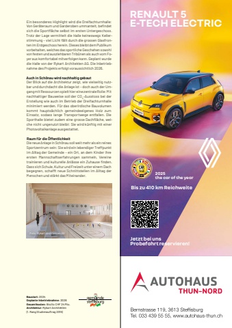 meine-region.ch Gemeinden 11Baustart: 2024Geplante Inbetriebnahme: 2026Gesamtkosten:%u0009Brutto%u0009CHF%u000924%u0009Mio.Architektur: Rykart%u0009Architekten%u0009(1.%u0009Rang%u0009Studienauftrag%u00092019)Ein besonderes Highlight wird die Dreifachturnhalle:Von Ger%u00e4teraum und Garderoben ummantelt, befi ndet sich die Sportfl %u00e4che selbst im ersten Untergeschoss. Trotz der Lage vermittelt die Halle keineswegs Kellerstimmung %u2013 viel Licht f%u00e4llt durch die grossen Glasfronten im Erdgeschoss herein. Dieses bleibt dem Publikum vorbehalten, welches das sportliche Geschehen sowohl von festen und ausziehbaren Trib%u00fcnen als auch vom Foyer aus komfortabel mitverfolgen kann. Geplant wurde die Halle von der Rykart Architekten AG. Die Inbetriebnahme des Projekts erfolgt voraussichtlich 2026.Auch in Sch%u00f6nau wird nachhaltig gebautDer Blick auf die Architektur zeigt, wie vielseitig nutzbar und durchdacht die Anlage ist %u2013 doch auch der Umgang mit Ressourcen spielt hier eine zentrale Rolle: Mit nachhaltiger Bauweise soll der CO2-Ausstoss bei der Erstellung wie auch im Betrieb der Dreifachturnhalle minimiert werden. F%u00fcr das oberirdische Bauvolumen kommt haupts%u00e4chlich gemeindeeigenes Holz zum Einsatz, sodass lange Transportwege entfallen. Die Sporthalle bietet zudem eine grosse Dachfl %u00e4che, welche nicht ungenutzt bleibt: Sie wird k%u00fcnftig mit einer Photovoltaikanlage ausgestattet.Raum f%u00fcr die %u00d6ffentlichkeitDie neue Anlage in Sch%u00f6nau soll weit mehr als ein reines Sportzentrum sein: Sie wird ein lebendiger Treffpunkt im Alltag der Gemeinde %u2013 ein Ort, an dem Kinder ihre ersten Mannschaftserfahrungen sammeln, Vereine trainieren und kulturelle Anl%u00e4sse ein Zuhause fi nden. Dass sich Schule, Kultur und Freizeit unter einem Dach begegnen, schafft neue Schnittstellen im Alltag der Menschen und st%u00e4rkt das Miteinander.Foto:%u0009Rykart%u0009Architekten%u0009AGInserat halbseitig, 101 x 297 mmRENAULT 5 E-TECH ELECTRIC2025 the car of the yearJetzt bei uns Probefahrt reservieren!Bis zu 410 km ReichweiteRENAULT 5 E-TECH ELECTRIC2025 the car of the yearJetzt bei uns Probefahrt reservieren!Bis zu 410 km ReichweiteRENAULT 5 E-TECH ELECTRIC2025 the car of the yearJetzt bei uns Probefahrt reservieren!Bis zu 410 km ReichweiteRENAULT 5 E-TECH ELECTRIC2025 the car of the yearJetzt bei uns Probefahrt reservieren!Bis zu 410 km Reichweite