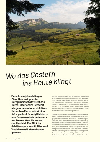 12 meine-region.ch meine-region.ch GemeindenWo das Gestern ins Heute klingtZwischen Alphornkl%u00e4ngen, Pinot Noir und gelebter Dorfgemeinschaft feiert das Berner Oberl%u00e4nder Bergdorf ein ganz besonderes Jubil%u00e4um. Unter dem Motto %u00abz%u00e4m%u00e4 l%u00e4be, fi r%u00e4 u gschtalt%u00e4%u00bb zeigt Habkern, was Zusammenhalt bedeutet %u2013 mit Festen, Geschichte und viel Herzblut. Ein Blick ins Jubil%u00e4umsjahr verr%u00e4t: Hier wird Tradition und Lebensfreude gefeiert.2025 ist ein besonderes Jahr f%u00fcr Habkern: Die Gemeinde feiert ihr 750-j%u00e4hriges Bestehen. F%u00fcr alle, die selbst nicht nachrechnen wollen: Erstmals erw%u00e4hnt wurde das Dorf Habkern, damals noch mit dem Ortsname in mittelhochdeutscher Schreibweise als Haberrchorn, im Jahr 1275. Zu diesem Anlass veranstaltet die Gemeinde zahlreiche Events und Besonderheiten %u2013 unter dem Motto: %u00abz%u00e4m%u00e4 l%u00e4be, fi r%u00e4 u gschtalt%u00e4%u00bb.Und das Motto meinen die Habcherinnen und Habcher ernst: Zusammenleben im Dorf bedeutet, sich zu begegnen und willkommen zu heissen %u2013 unabh%u00e4ngig von Herkunft, Alter und Lebenssituation. Es bedeutet, gemeinsame Werte und Traditionen zu leben, Feste und Br%u00e4uche zu zelebrieren. Und nicht zuletzt bedeutet es auch, als Gemeinschaft Neues anzupacken und sich stetig weiterzuentwickeln. Ganz in diesem Sinne bietet das Jubil%u00e4umsjahr ein vielf%u00e4ltiges Festprogramm:Die Veranstaltungen und Highlights reichen von Freifahrttagen f%u00fcr alle am Habkerer Skilift %u00fcber eine