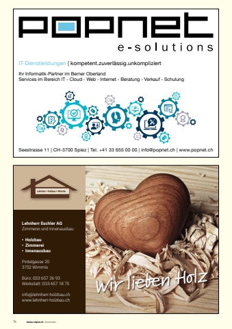 14 meine-region.ch GemeindenWir lieben HolzLehnherr Eschler AGZimmerei und Innenausbau%u2022 Holzbau%u2022 Zimmerei%u2022 InnenausbauPintelgasse 203752 WimmisB%u00fcro: 033 657 26 93Werkstatt: 033 657 18 75info@lehnherr-holzbau.chwww.lehnherr-holzbau.chIhr Informatik-Partner im Berner Oberland Services im Bereich IT - Cloud - Web - Internet - Beratung - Verkauf - SchulungSeestrasse 11 | CH-3700 Spiez | Tel. +41 33 655 00 00 | info@popnet.ch | www.popnet.chIT-Dienstleistungen | kompetent.zuverl%u00e4ssig.unkompliziert