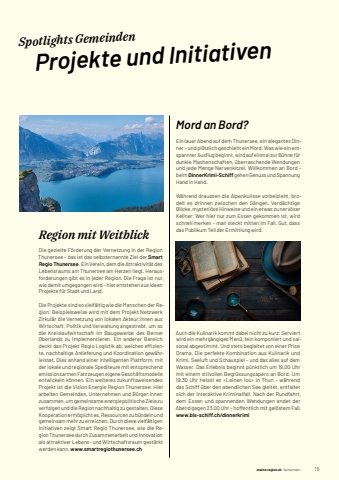 meine-region.ch meine-region.ch Gemeinden 151Spotlights Gemeinden Projekte und InitiativenRegion mit WeitblickDie gezielte F%u00f6rderung der Vernetzung in der Region Thunersee %u2013 das ist das selbsternannte Ziel der Smart Regio Thunersee. Ein Verein, dem die Attraktivit%u00e4t des Lebensraums am Thunersee am Herzen liegt. Herausforderungen gibt es in jeder Region. Die Frage ist nur, wie damit umgegangen wird %u2013 hier entstehen aus Ideen Projekte f%u00fcr Stadt und Land. Die Projekte sind so vielf%u00e4ltig wie die Menschen der Region: Beispielsweise wird mit dem Projekt Netzwerk Zirkul%u00e4r die Vernetzung von lokalen Akteur:innen aus Wirtschaft, Politik und Verwaltung angestrebt, um so die Kreislaufwirtschaft im Baugewerbe des Berner Oberlands zu implementieren. Ein anderer Bereich deckt das Projekt Regio Logistik ab, welches effi ziente, nachhaltige Anlieferung und Koordination gew%u00e4hrleistet. Dies anhand einer intelligenten Plattform, mit der lokale und regionale Spediteure mit entsprechend emissionsarmen Fahrzeugen eigene Gesch%u00e4ftsmodelle entwickeln k%u00f6nnen. Ein weiteres zukunftsweisendes Projekt ist die Vision Energie Region Thunersee: Hier arbeiten Gemeinden, Unternehmen und B%u00fcrger:innen zusammen, um gemeinsame energiepolitische Ziele zu verfolgen und die Region nachhaltig zu gestalten. Diese Kooperation erm%u00f6glicht es, Ressourcen zu b%u00fcndeln und gemeinsam mehr zu erreichen. Durch diese vielf%u00e4ltigen Initiativen zeigt Smart Regio Thunersee, wie die Region Thunersee durch Zusammenarbeit und Innovation als attraktiver Lebens- und Wirtschaftsraum gest%u00e4rkt werden kann. www.smartregiothunersee.chMord an Bord?Ein lauer Abend auf dem Thunersee, ein elegantes Dinner %u2013 und pl%u00f6tzlich geschieht ein Mord. Was wie ein entspannter Ausfl ug beginnt, wird auf einmal zur B%u00fchne f%u00fcr dunkle Machenschaften, %u00fcberraschende Wendungen und jede Menge Nervenkitzel. Willkommen an Bord %u2013 beim DinnerKrimi-Schiff gehen Genuss und Spannung Hand in Hand.W%u00e4hrend draussen die Alpenkulisse vorbeizieht, brodelt es drinnen zwischen den G%u00e4ngen. Verd%u00e4chtige Blicke, mysteri%u00f6se Hinweise und ein etwas zu nerv%u00f6ser Kellner: Wer hier nur zum Essen gekommen ist, wird schnell merken %u2013 man steckt mitten im Fall. Gut, dass das Publikum Teil der Ermittlung wird. Auch die Kulinarik kommt dabei nicht zu kurz: Serviert wird ein mehrg%u00e4ngiges Men%u00fc, fein komponiert und saisonal abgestimmt. Und stets begleitet von einer Prise Drama. Die perfekte Kombination aus Kulinarik und Krimi, Seeluft und Schauspiel %u2013 und das alles auf dem Wasser. Das Erlebnis beginnt p%u00fcnktlich um 19.00 Uhr mit einem stilvollen Begr%u00fcssungsap%u00e9ro an Bord. Um 19.30 Uhr heisst es %u00abLeinen los%u00bb in Thun %u2013 w%u00e4hrend das Schiff %u00fcber den abendlichen See gleitet, entfaltet sich der interaktive Kriminalfall. Nach der Rundfahrt, dem Essen und spannenden Wendungen endet der Abend gegen 23.00 Uhr %u2013 hoffentlich mit gel%u00f6stem Fall. www.bls-schiff.ch/dinnerkrimi