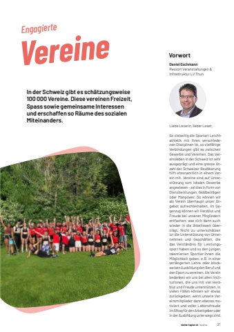 meine-region.ch Vereine 21VorwortDaniel EschmannRessort Veranstaltungen & Infrastruktur LV ThunLiebe Leserin, lieber Leser,So vielseitig die Sportart Leichtathletik mit ihren verschiedenen Disziplinen ist, so vielf%u00e4ltige Verbindungen gibt es zwischen Gewerbe und Vereinen. Das Vereinsleben in der Schweiz ist sehr ausgepr%u00e4gt und eine grosse Anzahl der Schweizer Bev%u00f6lkerung hilft ehrenamtlich in einem Verein mit. Vereine sind auf Unterst%u00fctzung vom lokalen Gewerbe angewiesen %u2013 sei dies in Form von Dienstleistungen, Geldbetr%u00e4gen oder Manpower. So k%u00f6nnen wir als Verein %u00fcberhaupt unser Angebot aufrechterhalten. Im Gegenzug k%u00f6nnen wir Herzblut und Freude bei unseren Mitgliedern entfachen, was sich dann auch wieder in die Arbeitswelt %u00fcbertr%u00e4gt. Nicht zu untersch%u00e4tzen ist die Unterst%u00fctzung von Unternehmen und Gesch%u00e4ften, die das Verst%u00e4ndnis f%u00fcr Leistungssport haben und so den jungen, talentierten Sportler:innen die M%u00f6glichkeit geben, z. B. in einer verl%u00e4ngerten Lehre oder blockweisen Ausbildung den Beruf und den Sport zu vereinen. Als Verein bedanken wir uns bei allen Institutionen, die uns mit viel Herzblut und Freude unterst%u00fctzen. In vielen F%u00e4llen k%u00f6nnen wir etwas zur%u00fcckgeben, wenn unsere Vereinsmitglieder dann ebenso motiviert und voller Lebensfreude im Alltag f%u00fcr den Arbeitgeber oder in der Ausbildung unterwegs sind.meine-region.ch VereineVereineEngagierteIn der Schweiz gibt es sch%u00e4tzungsweise 100 000 Vereine. Diese vereinen Freizeit, Spass sowie gemeinsame Interessen und erschaffen so R%u00e4ume des sozialen Miteinanders.