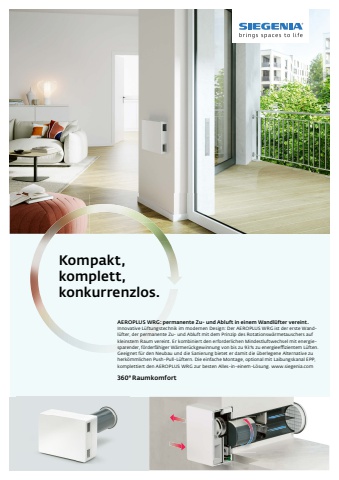 26 meine-region.ch JungtalentAEROPLUS WRG: permanente Zu- und Abluft in einem Wandl%u00fcfter vereint. Innovative L%u00fcftungstechnik im modernen Design: Der AEROPLUS WRG ist der erste Wandl%u00fcfter, der permanente Zu- und Abluft mit dem Prinzip des Rotationsw%u00e4rmetauschers auf kleinstem Raum vereint. Er kombiniert den erforderlichen Mindestluftwechsel mit energiesparender, f%u00f6rderf%u00e4higer W%u00e4rmer%u00fcckgewinnung von bis zu 93 % zu energiee%u0089 zientem L%u00fcften. Geeignet f%u00fcr den Neubau und die Sanierung bietet er damit die %u00fcberlegene Alternative zu herk%u00f6mmlichen Push-Pull-L%u00fcftern. Die einfache Montage, optional mit Laibungskanal EPP, komplettiert den AEROPLUS WRG zur besten Alles-in-einem-L%u00f6sung. www.siegenia.com360%u00b0 RaumkomfortKompakt, komplett, konkurrenzlos.