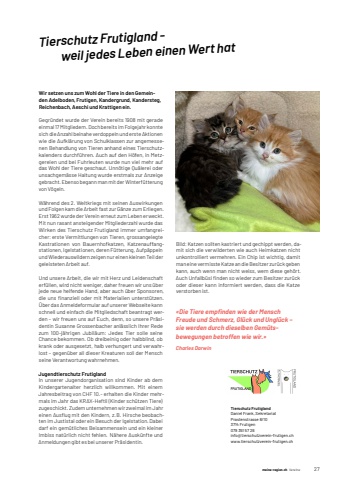 meine-region.ch meine-region.ch Vereine 271Tierschutz Frutigland - weil jedes Leben einen Wert hatWir setzen uns zum Wohl der Tiere in den Gemeinden Adelboden, Frutigen, Kandergrund, Kandersteg, Reichenbach, Aeschi und Krattigen ein.Gegr%u00fcndet wurde der Verein bereits 1908 mit gerade einmal 17 Mitgliedern. Doch bereits im Folgejahr konnte sich die Anzahl beinahe verdoppeln und erste Aktionen wie die Aufkl%u00e4rung von Schulklassen zur angemessenen Behandlung von Tieren anhand eines Tierschutzkalenders durchf%u00fchren. Auch auf den H%u00f6fen, in Metzgereien und bei Fuhrleuten wurde nun viel mehr auf das Wohl der Tiere geschaut. Unn%u00f6tige Qu%u00e4lerei oder unsachgem%u00e4sse Haltung wurde erstmals zur Anzeige gebracht. Ebenso begann man mit der Winterf%u00fctterung von V%u00f6geln. W%u00e4hrend des 2. Weltkriegs mit seinen Auswirkungen und Folgen kam die Arbeit fast zur G%u00e4nze zum Erliegen. Erst 1962 wurde der Verein erneut zum Leben erweckt. Mit nun rasant ansteigender Mitgliederzahl wurde das Wirken des Tierschutz Frutigland immer umfangreicher: erste Vermittlungen von Tieren, grossangelegte Kastrationen von Bauernhofkatzen, Katzenauffangstationen, Igelstationen, deren F%u00fctterung, Aufp%u00e4ppeln und Wiederauswildern zeigen nur einen kleinen Teil der geleisteten Arbeit auf.Und unsere Arbeit, die wir mit Herz und Leidenschaft erf%u00fcllen, wird nicht weniger, daher freuen wir uns %u00fcber jede neue helfende Hand, aber auch %u00fcber Sponsoren, die uns fi nanziell oder mit Materialien unterst%u00fctzen. %u00dcber das Anmeldeformular auf unserer Webseite kann schnell und einfach die Mitgliedschaft beantragt werden %u2013 wir freuen uns auf Euch, denn, so unsere Pr%u00e4sidentin Susanne Grossenbacher anl%u00e4sslich Ihrer Rede zum 100-j%u00e4hrigen Jubil%u00e4um: Jedes Tier solle seine Chance bekommen. Ob dreibeinig oder halbblind, ob krank oder ausgesetzt, halb verhungert und verwahrlost %u2013 gegen%u00fcber all dieser Kreaturen soll der Mensch seine Verantwortung wahrnehmen.Jugendtierschutz FrutiglandIn unserer Jugendorganisation sind Kinder ab dem Kindergartenalter herzlich willkommen. Mit einem Jahresbeitrag von CHF 10.- erhalten die Kinder mehrmals im Jahr das KRAX-Heftli (Kinder sch%u00fctzen Tiere) zugeschickt. Zudem unternehmen wir zweimal im Jahr einen Ausfl ug mit den Kindern, z. B. Hirsche beobachten im Justistal oder ein Besuch der Igelstation. Dabei darf ein gem%u00fctliches Beisammensein und ein kleiner Imbiss nat%u00fcrlich nicht fehlen. N%u00e4here Ausk%u00fcnfte und Anmeldungen gibt es bei unserer Pr%u00e4sidentin.Tierschutz FrutiglandDaniel Frank, SekretariatPrastenstrasse%u00098/10%u00093714%u0009Frutigen079%u0009351%u000957%u000926info@tierschutzverein-frutigen.chwww.tierschutzverein-frutigen.ch%u00abDie Tiere empfi nden wie der Mensch Freude und Schmerz, Gl%u00fcck und Ungl%u00fcck %u2013 sie werden durch dieselben Gem%u00fctsbewegungen betroffen wie wir.%u00bb Charles DarwinBild: Katzen sollten kastriert und gechippt werden, damit sich die verwilderten wie auch Heimkatzen nicht unkontrolliert vermehren. Ein Chip ist wichtig, damit man eine vermisste Katze an die Besitzer zur%u00fcck geben kann, auch wenn man nicht weiss, wem diese geh%u00f6rt. Auch Unfallb%u00fcsi fi nden so wieder zum Besitzer zur%u00fcck oder dieser kann informiert werden, dass die Katze verstorben ist.