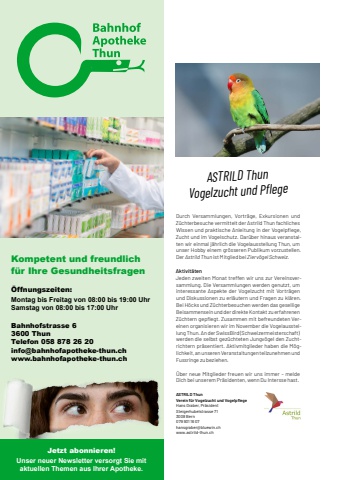 36 meine-region.ch meine-region.ch Vereine Teaser VreineASTRILD ThunVogelzucht und Pfl egeDurch Versammlungen, Vortr%u00e4ge, Exkursionen und Z%u00fcchterbesuche vermittelt der Astrild Thun fachliches Wissen und praktische Anleitung in der Vogelpfl ege, Zucht und im Vogelschutz. Dar%u00fcber hinaus veranstalten wir einmal j%u00e4hrlich die Vogelausstellung Thun, um unser Hobby einem gr%u00f6sseren Publikum vorzustellen. Der Astrild Thun ist Mitglied bei Zierv%u00f6gel Schweiz.Aktivit%u00e4tenJeden zweiten Monat treffen wir uns zur Vereinsversammlung. Die Versammlungen werden genutzt, um interessante Aspekte der Vogelzucht mit Vortr%u00e4gen und Diskussionen zu erl%u00e4utern und Fragen zu kl%u00e4ren. Bei H%u00f6cks und Z%u00fcchterbesuchen werden das gesellige Beisammensein und der direkte Kontakt zu erfahrenen Z%u00fcchtern gepfl egt. Zusammen mit befreundeten Vereinen organisieren wir im November die Vogelausstellung Thun. An der SwissBird (Schweizermeisterschaft) werden die selbst gez%u00fcchteten Jungv%u00f6gel den Zuchtrichtern pr%u00e4sentiert. Aktivmitglieder haben die M%u00f6glichkeit, an unseren Veranstaltungen teilzunehmen und Fussringe zu beziehen. %u00dcber neue Mitglieder freuen wir uns immer %u2013 melde Dich bei unserem Pr%u00e4sidenten, wenn Du Intersse hast.ASTRILD Thun Verein f%u00fcr Vogelzucht und Vogelpfl egeHans Graber, Pr%u00e4sidentSteigerhubelstrasse%u0009713008%u0009Bern079%u0009931%u000916%u000907hansgraber@bluewin.chwww.astrild-thun.chInserat halbseitig, 101 x 297 mmJetzt abonnieren!Unser neuer Newsletter versorgt Sie mit aktuellen Themen aus Ihrer Apotheke.Kompetent und freundlich f%u00fcr Ihre Gesundheitsfragen%u00d6ffnungszeiten: Montag bis Freitag von 08:00 bis 19:00 UhrSamstag von 08:00 bis 17:00 UhrBahnhofstrasse 63600 ThunTelefon 058 878 26 20info@bahnhofapotheke-thun.ch www.bahnhofapotheke-thun.ch