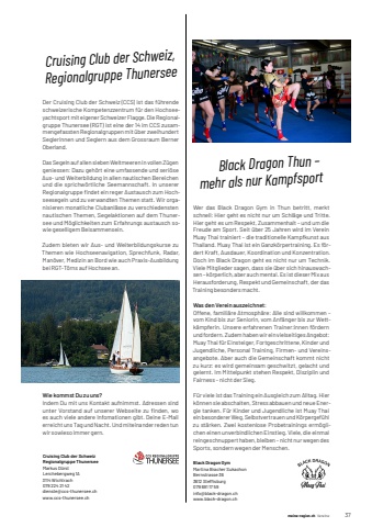 meine-region.ch Vereine 37meine-region.ch Vereine 4Cruising Club der Schweiz, Regionalgruppe ThunerseeDer Cruising Club der Schweiz (CCS) ist das f%u00fchrende schweizerische Kompetenzzentrum f%u00fcr den Hochseeyachtsport mit eigener Schweizer Flagge. Die Regionalgruppe Thunersee (RGT) ist eine der 14 im CCS zusammengefassten Regionalgruppen mit %u00fcber zweihundert Seglerinnen und Seglern aus dem Grossraum Berner Oberland.Das Segeln auf allen sieben Weltmeeren in vollen Z%u00fcgen geniessen: Dazu geh%u00f6rt eine umfassende und seri%u00f6se Aus- und Weiterbildung in allen nautischen Bereichen und die sprichw%u00f6rtliche Seemannschaft. In unserer Regionalgruppe fi ndet ein reger Austausch zum Hochseesegeln und zu verwandten Themen statt. Wir organisieren monatliche Clubanl%u00e4sse zu verschiedensten nautischen Themen, Segelaktionen auf dem Thunersee und M%u00f6glichkeiten zum Erfahrungs austausch sowie geselligem Beisammensein.Zudem bieten wir Aus- und Weiterbildungskurse zu Themen wie Hochseenavigation, Sprechfunk, Radar, Man%u00f6ver, Medizin an Bord wie auch Praxis-Ausbildung bei RGT-T%u00f6rns auf Hochsee an.Wie kommst Du zu uns?Indem Du mit uns Kontakt aufnimmst. Adressen sind unter Vorstand auf unserer Webseite zu fi nden, wo es auch viele andere Infomationen gibt. Deine E-Mail erreicht uns Tag und Nacht. Und miteinander reden tun wir sowieso immer gern.Cruising Club der Schweiz Regionalgruppe Thunersee Markus%u0009D%u00fcrst%u0009Lerchebergweg 1A3114%u0009Wichtrach079%u0009224%u000921%u000942dienste@ccs-thunersee.ch%u0009www.ccs-thunersee.chBlack Dragon Thun %u2013 mehr als nur KampfsportWer das Black Dragon Gym in Thun betritt, merkt schnell: Hier geht es nicht nur um Schl%u00e4ge und Tritte. Hier geht es um Respekt, Zusammenhalt %u2013 und um die Freude am Sport. Seit %u00fcber 25 Jahren wird im Verein Muay Thai trainiert %u2013 die traditionelle Kampfkunst aus Thailand. Muay Thai ist ein Ganzk%u00f6rpertraining. Es f%u00f6rdert Kraft, Ausdauer, Koordination und Konzentration. Doch im Black Dragon geht es nicht nur um Technik. Viele Mitglieder sagen, dass sie %u00fcber sich hinauswachsen %u2013 k%u00f6rperlich, aber auch mental. Es ist dieser Mix aus Herausforderung, Respekt und Gemeinschaft, der das Training besonders macht.Was den Verein auszeichnet:Offene, famili%u00e4re Atmosph%u00e4re: Alle sind willkommen %u2013 vom Kind bis zur Seniorin, vom Anf%u00e4nger bis zur Wettk%u00e4mpferin. Unsere erfahrenen Trainer:innen f%u00f6rdern und fordern. Zudem haben wir ein vielseitiges Angebot:Muay Thai f%u00fcr Einsteiger, Fortgeschrittene, Kinder und Jugendliche, Personal Training, Firmen- und Vereinsangebote. Aber auch die Gemeinschaft kommt nicht zu kurz: es wird gemeinsam geschwitzt, gelacht und gelernt. Im Mittelpunkt stehen Respekt, Disziplin und Fairness %u2013 nicht der Sieg.F%u00fcr viele ist das Training ein Ausgleich zum Alltag. Hier k%u00f6nnen sie abschalten, Stress abbauen und neue Energie tanken. F%u00fcr Kinder und Jugendliche ist Muay Thai ein besonderer Weg, Selbstvertrauen und K%u00f6rpergef%u00fchl zu st%u00e4rken. Zwei kostenlose Probetrainings erm%u00f6glichen einen unverbindlichen Einstieg. Viele, die einmal reingeschnuppert haben, bleiben %u2013 nicht nur wegen des Sports, sondern wegen der Menschen.Black Dragon GymMartina%u0009Bracher%u0009SukachonBernstrasse%u0009363612%u0009Steffi%u0009 %u0009sburg079%u0009691%u000917%u000959info@black-dragon.chwww.black-dragon.ch