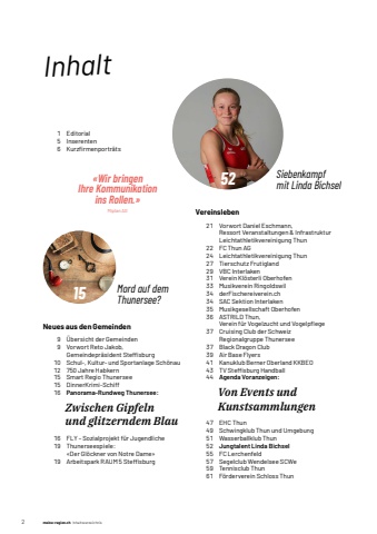 2 meine-region.ch Inhaltsverzeichnis%u0009 1%u0009 Editorial%u0009 5%u0009 Inserenten%u0009 6%u0009 Kurzfirmenportr%u00e4tsVereinsleben%u0009 21%u0009 Vorwort Daniel Eschmann,%u0009 %u0009 Ressort Veranstaltungen & Infrastruktur%u0009 %u0009 Leichtathletikvereinigung Thun%u0009 22%u0009 FC Thun AG%u0009 24%u0009 Leichtathletikvereinigung Thun%u0009 27%u0009 Tierschutz Frutigland%u0009 29%u0009 VBC Interlaken%u0009 31%u0009 Verein Kl%u00f6sterli Oberhofen%u0009 33%u0009 Musikverein Ringoldswil%u0009 34%u0009 derFischereiverein.ch%u0009 34%u0009 SAC Sektion Interlaken%u0009 35%u0009 Musikgesellschaft Oberhofen%u0009 36%u0009 ASTRILD Thun,%u0009 %u0009 Verein f%u00fcr Vogelzucht und Vogelpflege%u0009 37%u0009 Cruising Club der Schweiz%u0009 %u0009 Regionalgruppe Thunersee%u0009 37%u0009 Black Dragon Club%u0009 39%u0009 Air Base Flyers%u0009 41%u0009 Kanuklub Berner Oberland KKBEO%u0009 43%u0009 TV Steffisburg Handball%u0009 44%u0009 Agenda Voranzeigen:%u0009 47%u0009 EHC Thun%u0009 49%u0009 Schwingklub Thun und Umgebung%u0009 51%u0009 Wasserballklub Thun%u0009 52%u0009 Jungtalent Linda Bichsel%u0009 55%u0009 FC Lerchenfeld%u0009 57%u0009 Segelclub Wendelsee SCWe%u0009 59%u0009 Tennisclub Thun%u0009 61%u0009 F%u00f6rderverein Schloss Thun%u00abWir bringen Ihre Kommunikation ins Rollen.%u00bbMiplan AGVon Events und KunstsammlungenNeues aus den Gemeinden%u0009 9%u0009 %u00dcbersicht der Gemeinden%u0009 9%u0009 Vorwort Reto Jakob,%u0009 %u0009 Gemeindepr%u00e4sident Steffisburg%u0009 10%u0009 Schul-, Kultur- und Sportanlage Sch%u00f6nau%u0009 12%u0009 750 Jahre Habkern%u0009 15%u0009 Smart Regio Thunersee%u0009 15%u0009 DinnerKrimi-Schiff%u0009 16%u0009 Panorama-Rundweg Thunersee:%u0009 16%u0009 FLY %u2013 Sozialprojektf%u00fcr Jugendliche%u0009 19%u0009 Thunerseespiele: %u00abDer Gl%u00f6ckner von Notre Dame%u00bb%u0009 19%u0009 Arbeitspark RAUM 5 SteffisburgZwischen Gipfelnund glitzerndem BlauInhaltSiebenkampf mit Linda BichselMord auf dem Thunersee?5215