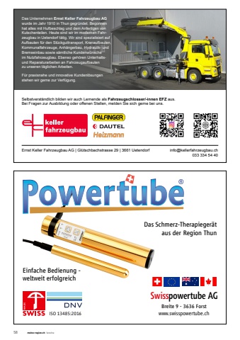 58 meine-region.ch VereineSwisspowertube AGDas Schmerz-Therapieger%u00e4t aus der Region ThunBreite 9 - 3636 Forstwww.swisspowertube.chEinfache Bedienung -weltweit erfolgreichISO 13485:2016Swisspowertube AGDas Schmerz-Therapieger%u00e4t aus der Region ThunBreite 9 - 3636 Forstwww.swisspowertube.chEinfache Bedienung -weltweit erfolgreichISO 13485:2016Swisspowertube AGDas Schmerz-Therapieger%u00e4t aus der Region ThunBreite 9 - 3636 Forstwww.swisspowertube.chEinfache Bedienung -weltweit erfolgreichISO 13485:2016 Swisspowertube AGDas Schmerz-Therapieger%u00e4t aus der Region ThunBreite 9 - 3636 Forstwww.swisspowertube.chEinfache Bedienung -weltweit erfolgreichISO 13485:2016Selbstverst%u00e4ndlich bilden wir auch Lernende als Fahrzeugschlosser/-innen EFZ aus.Bei Fragen zur Ausbildung oder offenen Stellen, melden Sie sich gerne bei uns.Ernst Keller Fahrzeugbau AG | Gl%u00fctschbachstrasse 29 | 3661 Uetendorf info@kellerfahrzeugbau.ch033 334 54 40Ernst Keller Fahrzeugbau AG | Gl%u00fctschbachstrasse 29 | 3661 Uetendorf info@kellerfahrzeugbau.ch033 334 54 40Selbstverst%u00e4ndlich bilden wir auch Lernende als Fahrzeugschlosser/-innen EFZ aus.Bei Fragen zur Ausbildung oder offenen Stellen, melden Sie sich gerne bei uns.Das Unternehmen Ernst Keller Fahrzeugbau AG wurde im Jahr 1910 in Thun gegr%u00fcndet. Begonnen hat alles mit Hufbeschlag und anfertigen von Kutschenteile bis zum heutigenmodernen Fahrzeugbau in Uetendorf.Wir sind spezialisiert auf Aufbauten f%u00fcr den St%u00fcckguttransport, Kranaufbauten, Kommunalfahrzeuge, Anh%u00e4ngerbau, Hydraulik- und Bremseinbauten sowie s%u00e4mtliche Kundenw%u00fcnsche im Nutzfahrzeugbau.F%u00fcr praxisnahe und innovative Kundenl%u00f6sungen stehen wir gerne zur Verf%u00fcgung.Das Unternehmen Ernst Keller Fahrzeugbau AG wurde im Jahr 1910 in Thun gegr%u00fcndet. Begonnen hat alles mit Hufbeschlag und dem Anfertigen von Kutschenteilen. Heute sind wir im modernen Fahrzeugbau in Uetendorf t%u00e4tig. Wir sind spezialisiert auf Aufbauten f%u00fcr den St%u00fcckguttransport, Kranaufbauten, Kommunalfahrzeuge, Anh%u00e4ngerbau, Hydraulik- und Bremseinbau sowie s%u00e4mtliche Kundenw%u00fcnsche im Nutzfahrzeugbau. Ebenso geh%u00f6ren Unterhaltsund Reparaturarbeiten an Fahrzeugaufbauten zu unseren t%u00e4glichen Arbeiten.F%u00fcr praxisnahe und innovative Kundenl%u00f6sungen stehen wir gerne zur Verf%u00fcgung.