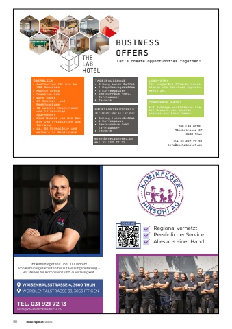 60 meine-region.ch VereineBUSINESSOFFERSLet's create opportunities together!THE LAB HOTELM%u00f6nchstrasse 373600 Thun+41 33 227 77 99info@thelabhotel.ch%u00dcBERBLICKAuditorium f%u00fcr bis zu200 PersonenMobile ArenaCreative LabWork Space17 Seminar- undMeetingr%u00e4ume70 moderne Hotelzimmerund 13 ServicedApartmentsFood Market und Hub Barmit 190 Sitzpl%u00e4tzen undTerrasseca. 68 Parkpl%u00e4tze undweitere in GehdistanzTAGESPAUSCHALE3-Gang Lunch-Buffet1 Begr%u00fcssungskaffe2 KaffeepausenSeminarraum inkl.TafelwasserTechnikHALBTAGESPAUSCHALE3-Gang Lunch-Buffet1 KaffeepauseSeminarraum inkl.TafelwasserTechnikLONG-STAYF%u00fcr tempor%u00e4re Mitarbeitendebieten wir Serviced Appartments an.CORPORATE RATESAuf Anfrage profitieren Sie bei Gruppen von Spezialpreisen auf Hotelzimmer.event@thelabhotel.ch+41 33 227 77 71(8 - 12 Uhr oder 13 - 17 Uhr)BUSINESSOFFERSLet's create opportunities together!THE LAB HOTELM%u00f6nchstrasse 373600 Thun+41 33 227 77 99info@thelabhotel.ch%u00dcBERBLICKAuditorium f%u00fcr bis zu200 PersonenMobile ArenaCreative LabWork Space17 Seminar- undMeetingr%u00e4ume70 moderne Hotelzimmerund 13 ServicedApartmentsFood Market und Hub Barmit 190 Sitzpl%u00e4tzen undTerrasseca. 68 Parkpl%u00e4tze undweitere in GehdistanzTAGESPAUSCHALE3-Gang Lunch-Buffet1 Begr%u00fcssungskaffe2 KaffeepausenSeminarraum inkl.TafelwasserTechnikHALBTAGESPAUSCHALE3-Gang Lunch-Buffet1 KaffeepauseSeminarraum inkl.TafelwasserTechnikLONG-STAYF%u00fcr tempor%u00e4re Mitarbeitendebieten wir Serviced Appartments an.CORPORATE RATESAuf Anfrage profitieren Sie bei Gruppen von Spezialpreisen auf Hotelzimmer.event@thelabhotel.ch+41 33 227 77 71(8 - 12 Uhr oder 13 - 17 Uhr)