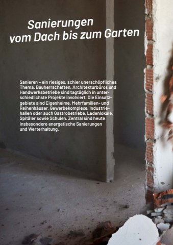 641 Gewerbe- und Vereinsmagazin meine-region.ch ThemenberichteThemenberichteSanieren %u2013 ein riesiges, schier unersch%u00f6pfl iches Thema. Bauherrschaften, Architekturb%u00fcros und Handwerksbetriebe sind tagt%u00e4glich in unterschiedlichste Projekte involviert. Die Einsatzgebiete sind Eigenheime, Mehrfamilien- und Reihenh%u00e4user, Gewerbekomplexe, Industriehallen oder auch Gastrobetriebe, Ladenlokale, Spit%u00e4ler sowie Schulen. Zentral sind heute insbesondere energetische Sanierungen und Werterhaltung. Sanierungen vom Dach bis zum Garten
