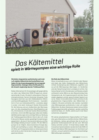 meine-region.ch meine-region.ch Themenberichte 731 Das K%u00e4ltemittelspielt in W%u00e4rmepumpen eine wichtige RolleDie bisher eingesetzten synthetischen und in der Luft stabilen K%u00e4ltemittel sind hocheffi zient und haben f%u00fcr das Anwendungsgebiet hervorragende Eigenschaften. Gelangen diese Stoffe jedoch in die Umwelt, beg%u00fcnstigt das den Treibhauseffekt. Neben Alternativen f%u00fcr Grossanlagen gilt gegenw%u00e4rtig vor allem das K%u00e4ltemittel R290 (Propan) als vielversprechender Ersatz. Die damit verbundenen Chancen sind weitreichend. Fast ein Viertel der Schweizer Treibhausgase stammen aus dem Geb%u00e4udesektor (Wohnund Gesch%u00e4ftsgeb%u00e4ude). Die Emissionen %u2013 hauts%u00e4chlich in Form von Kohlendioxid (CO2) %u2013 entstehen dabei in erster Linie beim Verbrauch fossiler Brennstoffe f%u00fcr die Heizung und zum Aufbereiten des Warmwassers. Um die umweltpolitischen Ziele (Reduktion der CO2-Emmissionen, Ersatz der fossilen Brennstoffe) zu erreichen, nimmt die W%u00e4rmepumpe neben den Geb%u00e4udeh%u00fcllensanierungen eine wichtige Rolle zur Senkung der Treibhausgasintensit%u00e4t ein. Denn in der Luft, in der Erde und im Wasser werden gewaltige Energiemengen gespeichert, die durch Sonneneinstrahlung und Niederschl%u00e4ge st%u00e4ndig erneuert werden. Mit der W%u00e4rmepumpe ist es m%u00f6glich, diese kostenlose Energie dauerhaft und nachhaltig zu nutzen. W%u00e4rmepumpen sind mit Blick auf Einsparpotenziale so vielversprechend, weil sie bis zu drei Viertel der Energie aus der Umwelt gewinnen k%u00f6nnen.Die Rolle des K%u00e4ltemittelsDiese Umweltw%u00e4rme aus Luft, Erdreich oder Wasser wird dank des tiefen Siedepunkts des K%u00e4ltemittels mittels Verdampfung dem K%u00e4ltekreis zugef%u00fchrt und so auf die W%u00e4rmepumpe %u00fcbertragen. Im Verdichter wird der Dampf komprimiert und dadurch erhitzt. Der heisse Dampf wird im Kondensator verfl %u00fcssigt und gibt schliesslich seine W%u00e4rme an den Wasserkreislauf des Heizsystems ab. Am Expansionsventil wird der Druck wieder abgebaut und der ganze Kreislauf beginnt von vorne. Dieser immerw%u00e4hrende Prozess wird durch die physikalischen Eigenschaften des K%u00e4ltemittels erm%u00f6glicht. Bis jetzt enthielten die meisten markt%u00fcblichen W%u00e4rmepumpen synthetische, in der Luft stabile K%u00e4ltemittel. Da diese Substanzen jedoch eine erh%u00f6hte Treibhausgasintensit%u00e4t aufweisen, werden zuk%u00fcnftig nat%u00fcrliche Gase, d. h. Stoffe, welche auch in der Natur vorkommen, eingesetzt. Mit seinen physikalischen Eigenschaften ist Propan eine gute Alternative zu herk%u00f6mmlichen K%u00e4ltemitteln. Als farbloses, nahezu geruchloses Gas ist es ein sogenannter Kohlenwasserstoff, der bei rund -190 Grad Celsius schmilzt und bei -42 Grad Celsius siedet. Alle Innovativen Systemanbieter werden bis Ende 2026 mit Propan betriebene W%u00e4rmepumpen ins Sortiment aufnehmen, um auch weiterhin effi ziente und nachhaltige W%u00e4rmel%u00f6sungen anzubieten.