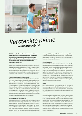 meine-region.ch meine-region.ch Themenberichte 751Versteckte Keime in unserer K%u00fccheDie K%u00fcche, oft als das Herzst%u00fcck unseres Zuhauses betrachtet, ist ein Ort der Kreativit%u00e4t, der W%u00e4rme und der n%u00e4hrenden Mahlzeiten. Doch hinter der gl%u00e4nzenden Fassade von Edelstahl und sauberen Oberfl %u00e4chen lauert eine unsichtbare Gefahr:Keime und Bakterien.Es ist ein tr%u00fcgerisches Gef%u00fchl der Sicherheit, das uns oft dazu verleitet, die Notwendigkeit einer gr%u00fcndlichen und regelm%u00e4ssigen Reinigung zu untersch%u00e4tzen. Dabei sind es gerade die unscheinbaren Ritzen, Fugen und Ger%u00e4te, die zu wahren Keimschleudern werden k%u00f6nnen, wenn wir ihnen nicht gen%u00fcgend Aufmerksamkeit schenken.Vermeintlich saubere Gegenst%u00e4ndeDenken wir nur einmal an den Sp%u00fclschwamm, der t%u00e4glich mit Essensresten und Feuchtigkeit in Ber%u00fchrung kommt. Seine por%u00f6se Struktur bietet einen idealen N%u00e4hrboden f%u00fcr Bakterien. Studien haben gezeigt, dass Sp%u00fclschw%u00e4mme zu den am st%u00e4rksten mit Keimen belasteten Gegenst%u00e4nden im Haushalt geh%u00f6ren. %u00c4hnlich verh%u00e4lt es sich mit Geschirrt%u00fcchern, die nach dem Abtrocknen feucht bleiben und so Bakterien einladen, sich zu vermehren. Werden diese nicht regelm%u00e4ssig bei hohen Temperaturen gewaschen, verteilen wir die Keime beim n%u00e4chsten Gebrauch fr%u00f6hlich weiter.K%u00fchlschrank als sauberer OrtAuch der K%u00fchlschrank, unser Stauraum gegen verderbliche Lebensmittel, birgt seine T%u00fccken. Ausgelaufene Fl%u00fcssigkeiten, vergessene Reste und unsichtbare Spritzer bilden einen idealen N%u00e4hrboden f%u00fcr Bakterien und Schimmelpilze. Besonders kritisch sind dabei die Gem%u00fcseschubladen und die Gummidichtungen an den T%u00fcren, die oft %u00fcbersehen werden. Eine regelm%u00e4ssige Reinigung mit Essigwasser oder speziellen K%u00fchlschrankreinigern ist unerl%u00e4sslich, um die Keimbelastung in Schach zu halten und die Frische unserer Lebensmittel zu gew%u00e4hrleisten.SchneidebretterBesondere Aufmerksamkeit verdienen auch die Arbeitsfl %u00e4chen, insbesondere im Bereich der Essenszubereitung. Rohes Fleisch und Gefl %u00fcgel k%u00f6nnen Salmonellen und andere gef%u00e4hrliche Bakterien %u00fcbertragen. Eine gr%u00fcndliche Reinigung mit heissem Wasser und Sp%u00fclmittel nach jedem Kontakt mit rohen Lebensmitteln ist unerl%u00e4sslich, um Kreuzkontaminationen zu vermeiden. Auch Schneidebretter, insbesondere solche aus Holz mit ihren feinen Rissen, k%u00f6nnen Bakterien beherbergen und sollten daher nach Gebrauch sorgf%u00e4ltig gereinigt und desinfi ziert werden.AbfallAuch der M%u00fclleimer, so notwendig er ist, kann eine Quelle unangenehmer Ger%u00fcche und Keime sein. Regelm%u00e4ssiges Leeren und eine gelegentliche Reinigung mit Desinfektionsmittel helfen, die Keimbelastung zu reduzieren.Es ist ein Zusammenspiel vieler kleiner Massnahmen, das letztendlich zu einer hygienisch sauberen K%u00fcche f%u00fchrt. Die regelm%u00e4ssige Reinigung der offensichtlichen Bereiche ist wichtig, aber die Aufmerksamkeit f%u00fcr die versteckten Ecken und Ger%u00e4te macht den entscheidenden Unterschied. Indem wir uns dieser unsichtbaren Gefahr bewusst werden und unsere Reinigungsgewohnheiten entsprechend anpassen, schaffen wir eine ges%u00fcndere und sicherere Umgebung f%u00fcr uns und unsere Gesundheit.