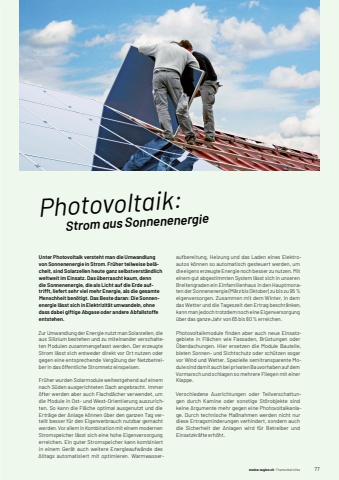meine-region.ch meine-region.ch Themenberichte 771Photovoltaik: Strom aus SonnenenergieUnter Photovoltaik versteht man die Umwandlung von Sonnenenergie in Strom. Fr%u00fcher teilweise bel%u00e4chelt, sind Solarzellen heute ganz selbstverst%u00e4ndlich weltweit im Einsatz. Das %u00fcberrascht kaum, denn die Sonnenenergie, die als Licht auf die Erde auftrifft, liefert sehr viel mehr Energie, als die gesamte Menschheit ben%u00f6tigt. Das Beste daran: Die Sonnenenergie l%u00e4sst sich in Elektrizit%u00e4t umwandeln, ohne dass dabei giftige Abgase oder andere Abfallstoffe entstehen.Zur Umwandlung der Energie nutzt man Solarzellen, die aus Silizium bestehen und zu mitein ander verschalteten Modulen zusammengefasst werden. Der erzeugte Strom l%u00e4sst sich entweder direkt vor Ort nutzen oder gegen eine entsprechende Verg%u00fctung der Netzbetreiber in das %u00f6ffentliche Stromnetz einspeisen. Fr%u00fcher wurden Solarmodule weitestgehend auf einem nach S%u00fcden ausgerichteten Dach angebracht. Immer %u00f6fter werden aber auch Flachd%u00e4cher verwendet, um die Module in Ost- und West- Orientierung auszurichten. So kann die Fl%u00e4che optimal ausgenutzt und die Ertr%u00e4ge der Anlage k%u00f6nnen %u00fcber den ganzen Tag verteilt besser f%u00fcr den Eigenverbrauch nutzbar gemacht werden. Vor allem in Kombination mit einem modernen Stromspeicher l%u00e4sst sich eine hohe Eigenversorgung erreichen. Ein guter Stromspeicher kann kombiniert in einem Ger%u00e4t auch weitere Energieauf w%u00e4nde des Alltags automatisiert mit optimieren. Warmwasseraufbereitung, Heizung und das Laden eines Elektroautos k%u00f6nnen so automatisch gesteuert werden, um die eigens erzeugte Energie noch besser zu nutzen. Mit einem gut abgestimmten System l%u00e4sst sich in unseren Breitengraden ein Einfamilienhaus in den Hauptmonaten der Sonnenenergie (M%u00e4rz bis Oktober) zu bis zu 95 % eigen versorgen. Zusammen mit dem Winter, in dem das Wetter und die Tageszeit den Ertrag beschr%u00e4nken, kann man jedoch trotzdem noch eine Eigenver sorgung %u00fcber das ganze Jahr von 65 bis 80 % er reichen.Photovoltaikmodule fi nden aber auch neue Einsatzgebiete in Fl%u00e4chen wie Fassaden, Br%u00fcstungen oder %u00dcberdachungen. Hier ersetzen die Module Bauteile, bieten Sonnen- und Sichtschutz oder sch%u00fctzen sogar vor Wind und Wetter. Spezielle semitransparente Module sind damit auch bei privaten Bauvorhaben auf dem Vormarsch und schlagen so mehrere Fliegen mit einer Klappe. Verschiedene Ausrichtungen oder Teilverschattungen durch Kamine oder sonstige St%u00f6robjekte sind keine Argumente mehr gegen eine Photovoltaikanlage. Durch technische Ma%u00dfnahmen werden nicht nur diese Ertragsminderungen verhindert, sondern auch die Sicherheit der Anlagen wird f%u00fcr Betreiber und Einsatzkr%u00e4fte erh%u00f6ht.