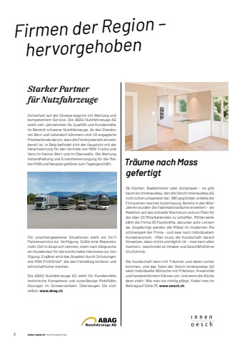 61 meine-region.ch meine-region.ch Kurzfirmenportr%u00e4ts Kurzfi rmenportr%u00e4tsFirmen der Region %u2013 hervorgehobenTr%u00e4ume nach Mass gefertigtOb K%u00fcchen, Badezimmer oder Arztpraxen %u2013 es gibt kaum ein Innenausbau, den die Oesch Innenausbau%u00a0AG nicht schon umgesetzt hat. 1981 gegr%u00fcndet, erlebte die Firma einen raschen Aufschwung. Bereits in den 90erJahren wurden die Fabrikationsr%u00e4ume erweitert %u2013 als Reaktion auf das schnelle Wachstum und um Platz f%u00fcr die %u00fcber 20%u00a0Mitarbeitenden zu schaffen. Mittlerweile z%u00e4hlt die Firma 35 Fachkr%u00e4fte, darunter acht Lernende. Angefertigt werden die M%u00f6bel im modernen Maschinenpark der Firma %u2013 und zwar nach individuellem Kundenwunsch. %u00abMan muss die Kundschaft darauf hinweisen, dass nichts unm%u00f6glich ist %u2013 man kann alles machen%u00bb, beschreibt es Inhaber und Gesch%u00e4ftsf%u00fchrer Urs Schmid. Die Kundschaft kann mit Tr%u00e4umen und Ideen vorbei kommen, und das Team der Oesch Innenausbau AG setzt individuelle W%u00fcnsche mit Pr%u00e4zision, Kreativit%u00e4t und handwerklichem K%u00f6nnen um. Und wenn die K%u00fcche dann steht: Wie man sie richtig pfl egt, fi ndet man im Beitrag auf Seite 75. www.oesch.chStarker Partnerf%u00fcr NutzfahrzeugeSicherheit auf der Strasse beginnt mit Wartung und kompetentem Service. Die ABAG Nutzfahrzeuge AG steht seit Jahrzehnten f%u00fcr Qualit%u00e4t und Kundenn%u00e4he im Bereich schwerer Nutzfahrzeuge. An den Standorten Bern und Uetendorf k%u00fcmmern sich 45 engagierte Mitarbeitende darum, dass die Flotte jederzeit einsatzbereit ist. In Belp befi ndet sich der Hauptsitz mit der Verantwortung f%u00fcr den Vertrieb von MAN Trucks und Vans im Kanton Bern und im Oberwallis. Die Wartung, Instandhaltung und Ersatzteilversorgung f%u00fcr die Marken MAN und Neoplan geh%u00f6ren zum Tagesgesch%u00e4ft.F%u00fcr unvorhergesehene Situationen steht ein 24/7- Pannenservice zur Verf%u00fcgung. Sollte eine Reparatur mehr Zeit in Anspruch nehmen, steht nach Absprache ein Kundentaxi f%u00fcr die komfortable Heimreise zur Verf%u00fcgung. Erg%u00e4nzt wird das Angebot durch Schulungen wie MAN Profi Drive%u00ae, die den Fahralltag sicherer und wirtschaftlicher machen. Die ABAG Nutzfahrzeuge AG steht f%u00fcr Kundenn%u00e4he, technische Kompetenz und zuverl%u00e4ssige Mobilit%u00e4tsl%u00f6sungen im Schwerverkehr. %u00dcberzeugen Sie sich selbst. www.abag.ch