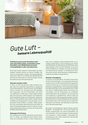 meine-region.ch meine-region.ch Themenberichte 791Gute Luft %u2013 bessere Lebensqualit%u00e4tDie Bedeutung eines guten Raumklimas sollte nicht untersch%u00e4tzt werden. Es beeinfl usst unsere Gesundheit, unser Wohlbefi nden und unsere Leistungsf%u00e4higkeit in allen Lebensbereichen. Durch den Einsatz moderner Technologien und nachhaltiger Praktiken k%u00f6nnen wir R%u00e4ume schaffen, die nicht nur komfortabel, sondern auch gesundheitsf%u00f6rdernd sind. Dabei ist es wichtig, die individuellen Bed%u00fcrfnisse der Nutzenden zu ber%u00fccksichtigen und das Raumklima entsprechend anzupassen.Besondere Aspekte im B%u00fcroIm B%u00fcro, wo viele Stunden des Tages verbracht werden, kann ein schlechtes Raumklima zu Konzentrationsschwierigkeiten, Kopfschmerzen und M%u00fcdigkeit f%u00fchren. Trockene Luft, verursacht durch Klimaanlagen oder Heizungen, reizt die Schleimh%u00e4ute und macht uns anf%u00e4lliger f%u00fcr Erk%u00e4ltungen. Studien haben gezeigt, dass eine optimale Luftfeuchtigkeit und Temperatur die Produktivit%u00e4t steigern und Fehlzeiten reduzieren k%u00f6nnen. Moderne B%u00fcros setzen daher zunehmend auf intelligente L%u00fcftungssysteme und Luftreiniger, um ein gesundes Arbeitsumfeld zu schaffen. Dabei spielen auch die verwendeten Baumaterialien eine Rolle, da diese Schadstoffe abgeben k%u00f6nnen. Ebenso ist eine angemessene Beleuchtung wichtig, da sie das Wohlbefi nden beeinfl ussen kann.R%u00fcckzugsort f%u00fcr ErholungDas Schlafzimmer erfordert besondere Aufmerksamkeit. Ein k%u00fchler, gut bel%u00fcfteter Raum f%u00f6rdert einen tiefen und erholsamen Schlaf. Zu hohe Temperaturen oder eine zu niedrige Luftfeuchtigkeit k%u00f6nnen zu unruhigem Schlaf f%u00fchren. Die Verwendung von nat%u00fcrlichen Materialien f%u00fcr Bettw%u00e4sche und Matratzen sowie regelm%u00e4ssiges L%u00fcften sind entscheidend, um ein optimales Schlafklima zu schaffen. Auch die Vermeidung von elektronischen Ger%u00e4ten im Schlafzimmer kann sich positiv auf den Schlaf auswirken, da diese elektromagnetische Felder erzeugen k%u00f6nnen.Gesunde LernumgebungIn Schulen und Kinderg%u00e4rten, wo Kinder einen Grossteil ihrer Zeit verbringen, ist ein gutes Raumklima besonders wichtig. Kinder sind empfi ndlicher gegen%u00fcber Luftverschmutzung und Temperaturschwankungen. Schlechte Luftqualit%u00e4t kann ihre Konzentrationsf%u00e4higkeit beeintr%u00e4chtigen und zu gesundheitlichen Problemen f%u00fchren. Regelm%u00e4ssiges L%u00fcften, der Einsatz von Luftreinigern und die Verwendung von schadstofffreien Materialien sind unerl%u00e4sslich, um eine gesunde Lernumgebung zu gew%u00e4hrleisten. Ebenso sollte auf eine angemessene Akustik geachtet werden, da L%u00e4rm die Konzentration und das Wohlbefi nden der Kinder beeintr%u00e4chtigen kann. Die Verwendung von nat%u00fcrlichen Materialien und Pfl anzen kann ebenfalls zu einem besseren Raumklima beitragen.Ob im B%u00fcro, im Schlafzimmer oder in Schulen und Kinderg%u00e4rten %u2013 die Qualit%u00e4t der Luft, die uns umgibt, hat direkte Auswirkungen auf unsere Gesundheit und unser Verhalten. Es ist ein komplexes Zusammenspiel von Temperatur, Luftfeuchtigkeit, Luftqualit%u00e4t und Luftbewegung, das unsere k%u00f6rperliche und geistige Verfassung beeinfl usst.