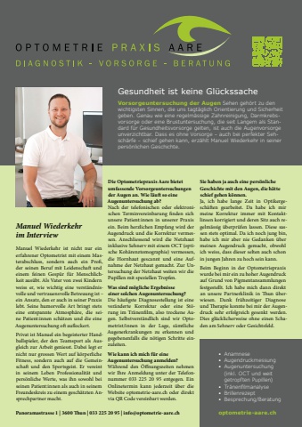 80 meine-region.ch ThemenberichteGesundheit ist keine Gl%u00fcckssacheVorsorgeuntersuchung der Augen Sehen geh%u00f6rt zu den wichtigsten Sinnen, die uns tagt%u00e4glich Orientierung und Sicherheit geben. Genau wie eine regelm%u00e4ssige Zahnreinigung, Darmkrebsvorsorge oder eine Brustuntersuchung, die seit Langem als Standard f%u00fcr Gesundheitsvorsorge gelten, ist auch die Augenvorsorge unverzichtbar. Dass es ohne Vorsorge %u2013 auch bei perfekter Sehsch%u00e4rfe %u2013 schief gehen kann, erz%u00e4hlt Manuel Wiederkehr in seiner pers%u00f6nlichen Geschichte.%u2022 Anamnese%u2022 Augendruckmessung%u2022 Augenuntersuchung(inkl. OCT und weit getropften Pupillen)%u2022 Tr%u00e4nenfi lmanalyse%u2022 Brillenrezept%u2022 Besprechung/Beratungoptometrie-aare.chManuel Wiederkehr im InterviewManuel Wiederkehr ist nicht nur ein erfahrener Optometrist mit einem Masterabschluss, sondern auch ein Profi , der seinen Beruf mit Leidenschaff und einem feinen Gesp%u00fcr f%u00fcr Menschlichkeit aus%u00fcbt. Als Vater von zwei Kindern weiss er, wie wichtig eine verst%u00e4ndnisvolle und vertrauensvolle Betreuung ist %u2013 ein Ansatz, den er auch in seiner Praxis lebt. Seine humorvolle Art bringt stets eine entspannte Atmosph%u00e4re, die seine Patient:innen sch%u00e4tzen und die eine Augen untersuchung off auffl ockert. Privat ist Manuel ein begeisterter Handballspieler, der den Teamsport als Ausgleich zur Arbeit geniesst. Dabei legt er nicht nur grossen Wert auf k%u00f6rperliche Fitness, sondern auch auf die Gemeinschaff und den Sportsgeist. Er vereint in seinem Leben Professionalit%u00e4t und pers%u00f6nliche Werte, was ihn sowohl bei seinen Patient:innen als auch in seinem Freundeskreis zu einem gesch%u00e4tzten Ansprechpartner macht.Die Optometriepraxis Aare bietet umfassende Vorsorgeuntersuchungen der Augen an. Wie l%u00e4ufi so eine Augenuntersuchung ab?Nach der telefonischen oder elektronischen Terminvereinbarung fi nden sich unsere Patient:innen in unserer Praxis ein. Beim herzlichen Empfang wird der Augendruck und die Korrektur vermessen. Anschliessend wird die Netzhaut inklusive Sehnerv mit einem OCT (optische Koh%u00e4renztomographie) vermessen, die Hornhaut gescannt und eine Aufnahme der Netzhaut gemacht. Zur Untersuchung der Netzhaut weiten wir die Pupillen mit speziellen Tropfen.Was sind m%u00f6gliche Ergebnisse einer solchen Augenuntersuchung?Die h%u00e4ufi gste Diagnosestellung ist eine ver%u00e4nderte Korrektur oder eine St%u00f6rung im Tr%u00e4nenfi lm, also trockene Augen. Selbstverst%u00e4ndlich sind wir Optometrist/innen in der Lage, s%u00e4mtliche Augenerkrankungen zu erkennen und gegebenenfalls die n%u00f6tigen Schritte einzuleiten.Wie kann ich mich f%u00fcr eine Augen untersuchung anmelden?W%u00e4hrend den %u00d6ffi nungszeiten nehmen wir Ihre Anmeldung unter der Telefonnummer 033 225 20 95 entgegen. Ein Onlinetermin kann jederzeit %u00fcber die Website optometrie-aare.ch oder direkt via QR Code vereinbart werden.Sie haben ja auch eine pers%u00f6nliche Geschichte mit den Augen, die h%u00e4tte schief gehen k%u00f6nnen.Ja, ich habe lange Zeit in Optikergesch%u00e4ff en gearbeitet. Da habe ich mir meine Korrektur immer mit Kontaktlinsen korrigiert und deren Sitz auch regelm%u00e4ssig %u00fcberpr%u00fcfen lassen. Diese sassen stets optimal. Da ich noch jung bin, habe ich mir aber nie Gedanken %u00fcber meinen Augendruck gemacht, obwohl ich weiss, dass dieser selten auch schon in jungen Jahren zu hoch sein kann. Beim Beginn in der Optometriepraxis wurde bei mir ein zu hoher Augendruck auf Grund von Pigmentansammlungen festgestellt. Ich habe mich dann direkt an unsere Partnerklinik in fl un %u00fcberwiesen. Dank fr%u00fchzeitiger Diagnose und fl erapie konnte bei mir der Augendruck sehr erfolgreich gesenkt werden. Dies gl%u00fccklicherweise ohne einen Schaden am Sehnerv oder Gesichtsfeld.Panoramastrasse 1 | 3600 ff un | 033 225 20 95 | info@optometrie-aare.ch