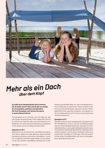 861 meine-region.ch Top LehrbetriebMehr als ein Dach %u00fcber dem KopfDu willst einen handwerklichen Beruf erlernen, der dir Spass macht? Dann bist du bei uns richtig! Du wirst gesehen, gef%u00f6rdert und gefordert! Wir sind Teamplayer und nehmen dich gerne in unsere Mannschaft auf.Du bist gerne an der frischen Luft und liebst es, deinen K%u00f6rper herauszufordern? Wir bilden dich Schritt f%u00fcr Schritt zur Fachfrau oder zum Fachmann aus. Es begeistert uns, deine positive Entwicklung zu begleiten und zu sehen, wie du zum Bauprofi heranreifst.Abdichter/in EFZAbdichter/in ist ein attraktiver und abwechslungsreicher Beruf. Abdichter/innen d%u00e4mmen anspruchsvolle Dachkonstruktionen und dichten Flachd%u00e4cher, Terrassen, Vord%u00e4cher und Keller gegen Regen und Grundwasser ab. Sie sch%u00fctzen Flachd%u00e4cher fachgerecht vor der Witterung und helfen daher mit, den Energieverbrauch eines Geb%u00e4udes zu reduzieren. Davon profi tiert das Portemonnaie des Besitzers genauso wie die Umwelt. Abdichter/innen brauchen Ausdauer und arbeiten exakt. Ihr Arbeitsplatz ist oft im Freien und verlangt handwerkliches Geschick.Spengler/in EFZSpengler/innen braucht es fast %u00fcberall, wo gebaut wird. Mit Metalld%u00e4chern, Rinnen, Rohren und Abdeckungen machen sie ein Geb%u00e4ude wetterfest. Spengler/in ist ein vielseitiger Beruf, denn jedes Geb%u00e4ude sowie die Industrie brauchen solide Spenglerarbeiten. Beweglichkeit, exaktes Arbeiten und Freude am Gestalten sollte ein/e angehende/r Spengler/in mitbringen. Wer alles andere will als einen Schreibtischjob, der kann im Spenglerberuf seine Berufung fi nden.