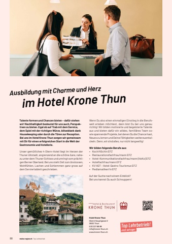 88 meine-region.ch Top Lehrbetrieb meine-region.ch Top Lehrbetriebe 1Hotel Krone ThunObere%u0009Hauptgasse%u000923600%u0009Thun033%u0009227%u000988%u000988info@krone-thun.chwww.krone-thun.chAusbildung mit Charme und Herz im Hotel Krone ThunTalente formen und Chancen bieten %u2013 daf%u00fcr stehen wir! Nachhaltigkeit bedeutet f%u00fcr uns auch, Perspektiven zu bieten. Egal ob auf Trab mit dem Service, dem Spiel mit der richtigen W%u00fcrze, blitzeblank dank Housekeeping oder durch die T%u00fcren zur Reception. Bei uns im Hotel Krone Thun sorgen wir gemeinsam mit Dir f%u00fcr einen erfolg reichen Start in die Welt der Gastronomie und Hotellerie.Unser gem%u00fctliches 4-Stern-Hotel liegt im Herzen der Thuner Altstadt, angrenzend an die sch%u00f6ne Aare, nahezu unter dem Thuner Schloss und umringt vom pr%u00e4chtigen Berner Oberland. Bei uns steht Zeit zum Anstossen, Wohlf%u00fchlen, Lachen und Schlemmen ganz gross auf dem Serviertablett geschrieben.Wenn Du also einen einmaligen Einstieg in die Berufswelt erleben m%u00f6chtest, dann bist Du bei uns genau richtig! Wir bilden motivierte und begeisterte Talente aus und bieten daf%u00fcr ein wildes, famili%u00e4res Team sowie spannende Projekte, bei denen Du die Chance hast, Neues zu lernen und Deine F%u00e4higkeiten weiterzuentwickeln. Denn, wir sind alles, nur nicht langweilig!Wir bilden folgende Berufe aus:%u2022 Koch/K%u00f6chin EFZ%u2022 Restaurationsfachfrau/mann EFZ%u2022 Hotel-Kommunikationsfachfrau/mann (HoKo) EFZ%u2022 Hotelfachfrau/mann EFZ%u2022 KV HGT %u2013 Hotel-Gastro-Tourismus EFZ%u2022 Mediamatiker/in EFZAuf der Suche nach einem Einblick?Bei uns kannst Du auch Schnuppern!
