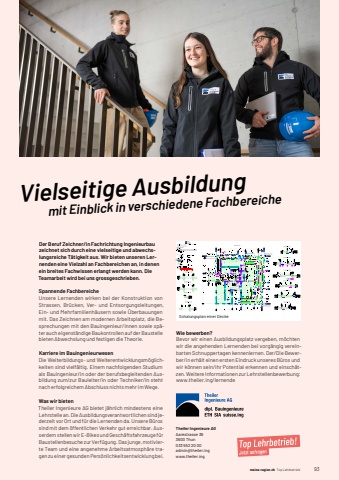 meine-region.ch meine-region.chTop Lehrbetriebe Top Lehrbetrieb 931Theiler Ingenieure AGAarestrasse%u0009363600%u0009Thun033%u0009552%u000920%u000900admin@theiler.ingwww.theiler.ingDer Beruf Zeichner/in Fachrichtung Ingenieurbau zeichnet sich durch eine vielseitige und abwechslungsreiche T%u00e4tigkeit aus. Wir bieten unseren Lernenden eine Vielzahl an Fachbereichen an, in denen ein breites Fachwissen erlangt werden kann. Die Teamarbeit wird bei uns grossgeschrieben.Spannende FachbereicheUnsere Lernenden wirken bei der Konstruktion von Strassen, Br%u00fccken, Ver- und Entsorgungsleitungen, Ein- und Mehrfamilienh%u00e4usern sowie %u00dcberbauungen mit. Das Zeichnen am modernen Arbeitsplatz, die Besprechungen mit den Bauingenieur/innen sowie sp%u00e4ter auch eigenst%u00e4ndige Baukontrollen auf der Baustelle bieten Abwechslung und festigen die Theorie. Karriere im BauingenieurwesenDie Weiterbildungs- und Weiterentwicklungsm%u00f6glichkeiten sind vielf%u00e4ltig. Einem nachfolgenden Studium als Bauingenieur/in oder der berufsbegleitenden Ausbildung zum/zur Bauleiter/in oder Techniker/in steht nach erfolgreichem Abschluss nichts mehr im Wege.Was wir bietenTheiler Ingenieure AG bietet j%u00e4hrlich mindestens eine Lehrstelle an. Die Ausbildungsverantwortlichen sind jederzeit vor Ort und f%u00fcr die Lernenden da. Unsere B%u00fcros sind mit dem %u00f6ffentlichen Verkehr gut erreichbar. Ausserdem stellen wir E-Bikes und Gesch%u00e4ftsfahrzeuge f%u00fcr Baustellenbesuche zur Verf%u00fcgung. Das junge, motivierte Team und eine angenehme Arbeitsatmosph%u00e4re tragen zu einer gesunden Pers%u00f6nlichkeitsentwicklung bei.Wie bewerben?Bevor wir einen Ausbildungsplatz vergeben, m%u00f6chten wir die angehenden Lernenden bei vorg%u00e4ngig vereinbarten Schnuppertagen kennenlernen. Der/Die Bewerber/in erh%u00e4lt einen ersten Eindruck unseres B%u00fcros und wir k%u00f6nnen sein/ihr Potential erkennen und einsch%u00e4tzen. Weitere Informationen zur Lehrstellenbewerbung:www.theiler.ing/lernendeVielseitige Ausbildung mit Einblick in verschiedene FachbereicheSchalungsplan%u0009einer%u0009Decke